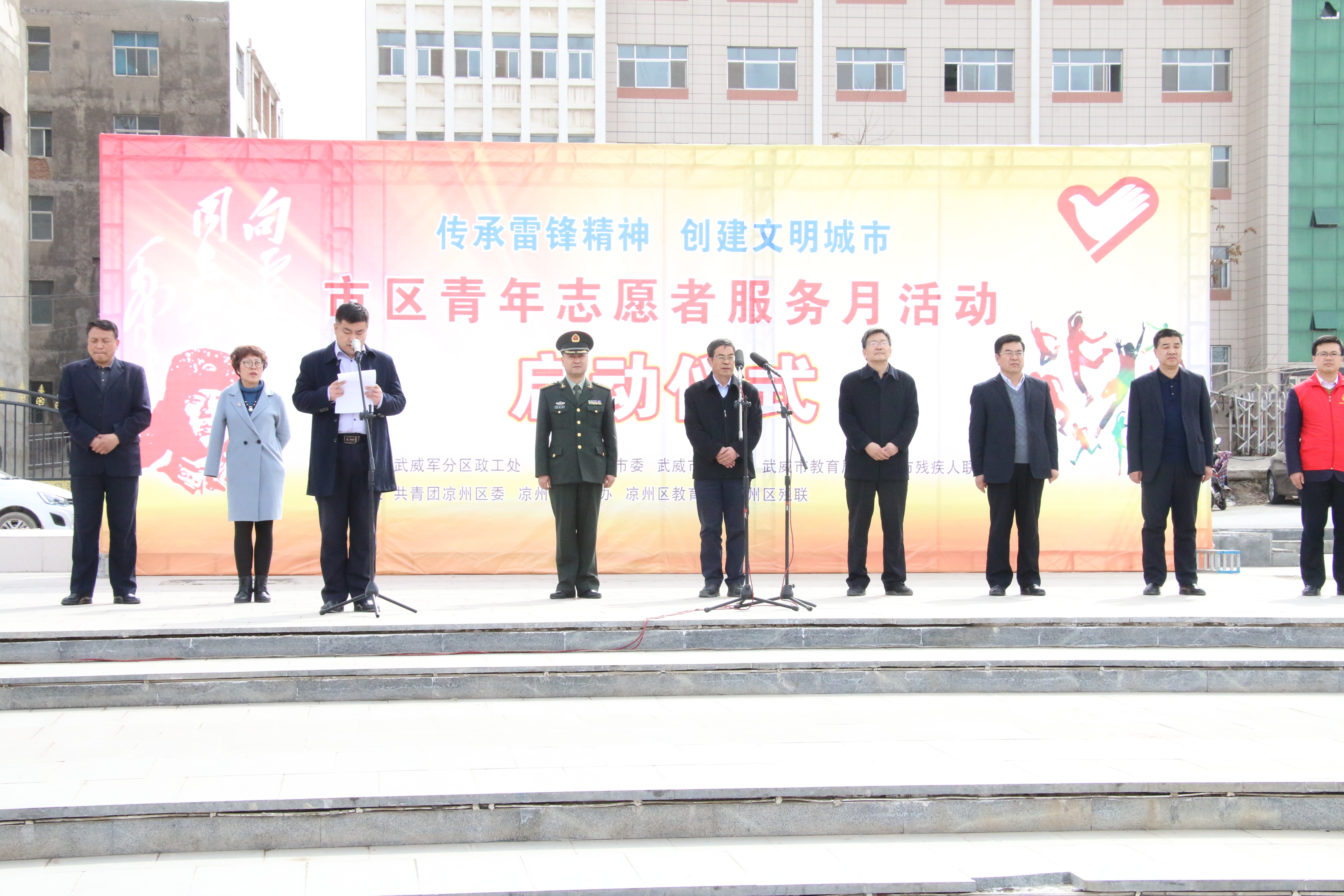 今年是毛澤東等老一輩革命家為雷鋒同志題詞55周年,3月5日是中國青年志愿者服務日。 3月5日下午,學院50名志愿者在武威市文化廣場參加了全市志愿者服務月活動啟動儀式,活動現(xiàn)場氣氛熱烈,市領導為我院志愿服務隊進行了授旗,青年志愿者代表宣讀了倡議書,全體志愿者重溫了青年志愿者誓詞。