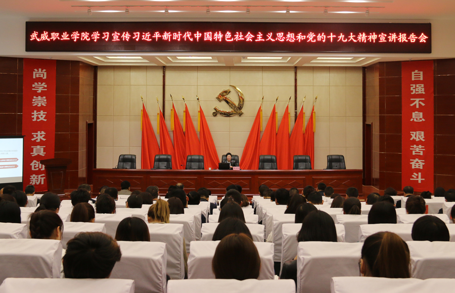 為進(jìn)一步加強(qiáng)對習(xí)近平新時(shí)代中國特色社會主義思想和黨的十九大精神的學(xué)習(xí)宣傳教育,4月9日下午,學(xué)院黨委在菁英廳舉行“武威職業(yè)學(xué)院深入學(xué)習(xí)宣傳貫徹習(xí)近平新時(shí)代中國特色社會主義思想和黨的十九大精神宣講報(bào)告會”,邀請武威市委講師團(tuán)成員、市委黨校副教授蔡生菊為學(xué)院各院系師生代表、副科級以上領(lǐng)導(dǎo)干部、直屬附屬醫(yī)院領(lǐng)導(dǎo)共計(jì)200余人作宣講報(bào)告。宣講報(bào)告會由宣傳統(tǒng)戰(zhàn)部部長王繼林主持。