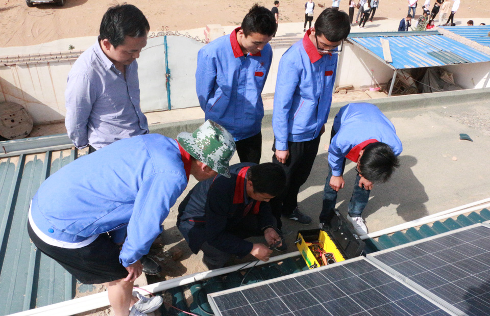 走進圓夢新村,由學院校辦企業(yè)武威泰豐新能源有限公司建設的200戶貧困家庭戶均3kw的分布式光伏發(fā)電系統(tǒng)映入眼簾。在社區(qū)書記郭林春的帶領下,黨員教師和學生入黨積極分子上門幫助用戶檢查維修光伏發(fā)電設備,檢查光伏組件的老化跡象以及所有連接器是否連接緊密、有無腐蝕現(xiàn)象,檢查組件是否接地良好。了解農戶的需求,為農戶講解光伏設備后期維護、電費結算方式以及國家扶貧惠民的政策等知識,并對部分農戶屋頂光伏組件故障進行了排除,對光伏組件進行了大面積清潔維護。