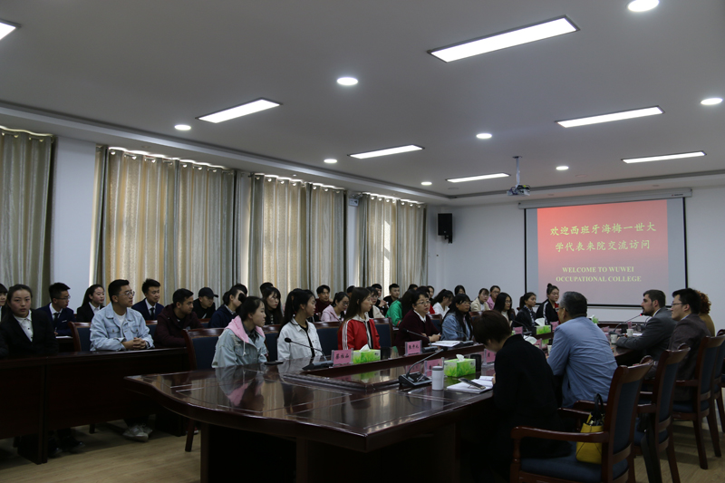 座談會(huì)上,田迎春代表全院師生對海梅一世大學(xué)到訪學(xué)院表示歡迎,對省國際交流與合作服務(wù)中心對學(xué)院的關(guān)心表示感謝,并向來訪客人簡要介紹了武威文化歷史、學(xué)院建設(shè)發(fā)展情況、學(xué)院國際交流與合作開展情況。來訪客人對學(xué)院近年來的巨大發(fā)展表示贊賞,對學(xué)院國際交流與合作開展工作表示肯定。Ana女士通過PPT展示介紹了海梅一世大學(xué),希望雙方進(jìn)一步進(jìn)行合作。賓主雙方還就校際交流、語言培訓(xùn)、赴西班牙專升碩留學(xué)項(xiàng)目等共同關(guān)心的問題進(jìn)行了深入交流。