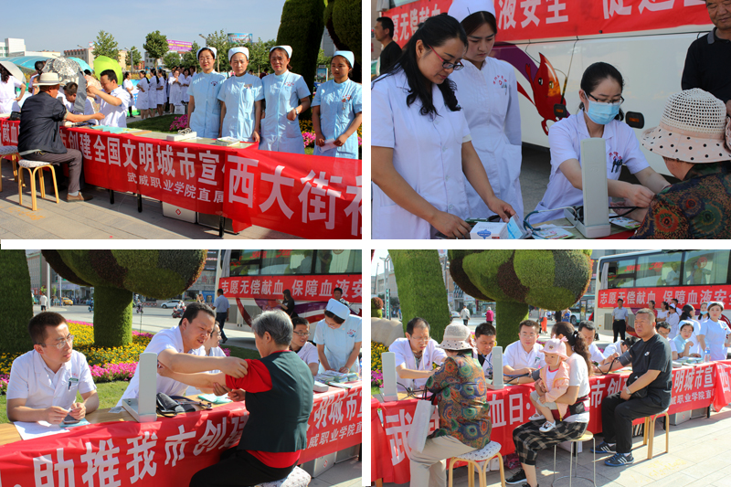 為保障臨床用血安全,給我市創(chuàng)建全國(guó)文明城市活動(dòng)增亮添彩,由武威市衛(wèi)生計(jì)生委、武威市紅十字會(huì)主辦,武威市中心血站承辦的“世界無(wú)償獻(xiàn)血者日”大型宣傳、義診、獻(xiàn)血活動(dòng)于6月14日在武威市文化廣場(chǎng)隆重舉行。學(xué)院附屬醫(yī)院醫(yī)護(hù)人員、學(xué)院紅十字志愿者方隊(duì)、無(wú)償獻(xiàn)血獲獎(jiǎng)?wù)叻疥?duì)等30余家單位的干部群眾參加了活動(dòng)。