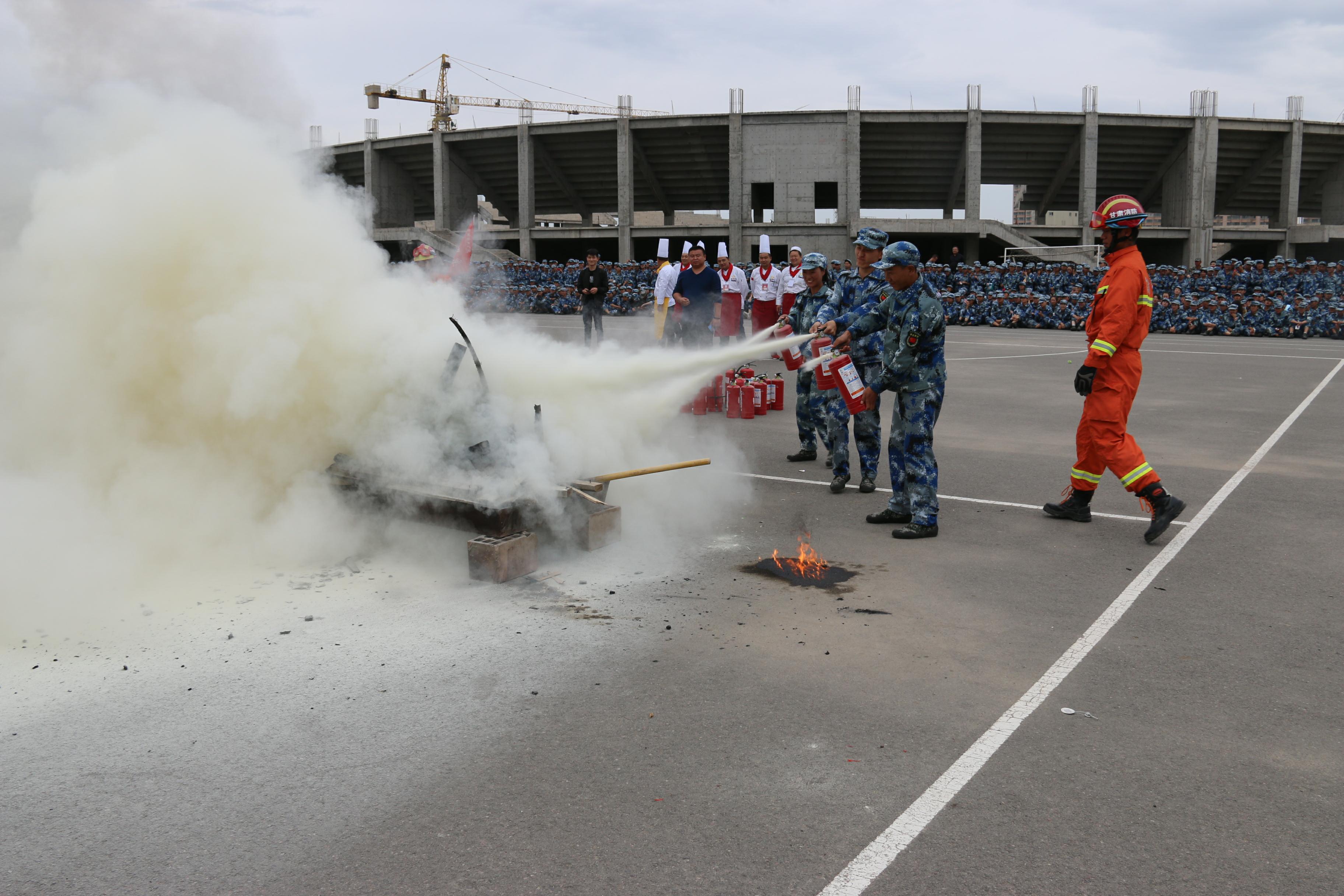 隨后,所有參演學(xué)生整隊(duì)到操場(chǎng)參加了滅火演練。在消防官兵的講解和和示范下,同學(xué)們體驗(yàn)了處置著火液化氣瓶、干粉滅火器滅火、穿消防救生衣、通過(guò)模擬煙室等操作。