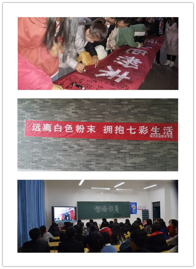 現(xiàn)代農(nóng)業(yè)技術(shù)系結(jié)合自身實(shí)際和條件,重點(diǎn)開展了以下活動。一是通過在行樹樓張貼“遠(yuǎn)離白色粉末擁抱七彩生活”禁毒橫幅,號召全系師生創(chuàng)建和諧、文明、無毒的校園環(huán)境;二是各班開展了禁毒宣傳主題班會,宣傳毒品危害,普及防毒知識,警示大家珍愛生命,遠(yuǎn)離毒品;三是組織學(xué)生參加學(xué)院禁毒征文大賽,用語言表達(dá)禁毒的決心;四是團(tuán)學(xué)會組織各班同學(xué)網(wǎng)上參觀“中國禁毒數(shù)字展覽館”,觀看禁毒題材的優(yōu)秀微電影《一路有你》、《少年的秘密》、《蛻變》、《愛心帶你回家》,讓在場同學(xué)深刻感受到毒品的危害,堅(jiān)定了同學(xué)們禁毒防毒的信心。
