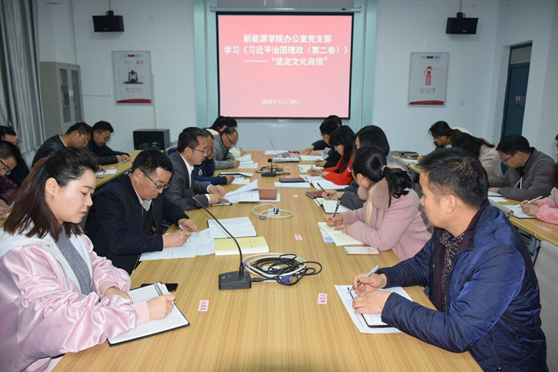 為貫徹落實黨的十九大精神和《習(xí)近平談治國理政(第二卷)》中關(guān)于堅定文化自信的相關(guān)精神,11月29日,新能源學(xué)院辦公室黨支部組織開展集中學(xué)習(xí)和交流會,支部書記任陶主持會議,全體黨員參加了會議。