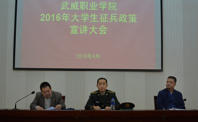 為支持國防建設(shè),鼓勵(lì)大學(xué)生參軍入伍保家衛(wèi)國,學(xué)院于4月14日下午在尚德樓正德廳召開了2016年大學(xué)生應(yīng)征入伍政策宣講暨動(dòng)員大會。學(xué)生工作處負(fù)責(zé)人王守云主持會議,涼州區(qū)人民武裝部政治工作科科長趙輝泉、涼州區(qū)西關(guān)街政法書記趙光慶到場宣講。學(xué)院280多名師生參加了宣講大會。