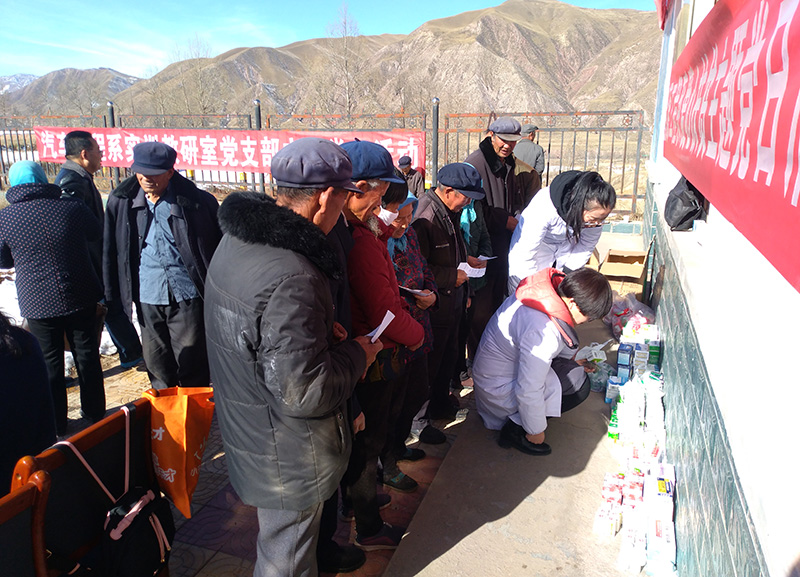 到達(dá)目的地后,黨員們不顧辛勞,分成兩組,一組由護(hù)理系黨總支書記張建輝帶領(lǐng)前往臥病在床的扶貧對(duì)象家里,親切詢問(wèn)病情及家里近況,送上常備藥品。另一組在當(dāng)?shù)卮宀窟M(jìn)行義診活動(dòng),醫(yī)護(hù)人員仔細(xì)給村民們進(jìn)行體檢,耐心解答、細(xì)心診治;對(duì)前來(lái)問(wèn)診的村民認(rèn)真進(jìn)行血壓、血糖、丙肝等項(xiàng)目的檢測(cè)、免費(fèi)發(fā)放藥品并對(duì)糖尿病、高血壓等慢性病的飲食、活動(dòng)和用藥進(jìn)行指導(dǎo),普及衛(wèi)生常識(shí)和健康知識(shí)。醫(yī)護(hù)人員的精心服務(wù)讓村民們倍感欣慰,受到了他們的熱烈歡迎和一致稱贊。