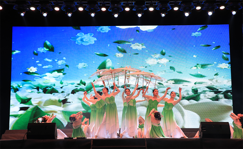 晚會(huì)中,在音樂(lè)學(xué)科專業(yè)頗有建樹的幾位老師表演了高水準(zhǔn)的器樂(lè)合奏《贊歌》,讓師生陶醉于器樂(lè)演奏的優(yōu)美旋律和意境,贏得了全場(chǎng)經(jīng)久不息的掌聲。大學(xué)生藝術(shù)團(tuán)舞蹈隊(duì)和聲樂(lè)隊(duì)表演的歌伴舞《紅旗飄飄》《美麗中國(guó)》激情四射、唯美動(dòng)聽,詮釋了青年學(xué)子對(duì)祖國(guó)的熱愛和深情祝福。人文藝術(shù)教育系選送的現(xiàn)代舞《追逐夢(mèng)想》用歡快的舞步展現(xiàn)了青年最富有朝氣、最富有夢(mèng)想的精神風(fēng)貌,《茉莉花開》更是讓師生陶醉于傳統(tǒng)舞蹈的優(yōu)美意境。雙人舞表演《鄉(xiāng)·遠(yuǎn)方》舞蹈動(dòng)作豪放、粗狂但不失委婉、細(xì)致,為我們呈現(xiàn)出“天之驕子”的氣概。校園好聲音教師組冠軍和學(xué)生組冠軍合唱的歌曲《你是我的眼》傳唱了職院好聲音,定格了大家的青春記憶。校園二把手樂(lè)隊(duì)帶來(lái)的歌曲《平凡之路》引起全場(chǎng)轟動(dòng),將晚會(huì)推向了高潮,同學(xué)們紛紛點(diǎn)亮了自己的手機(jī),現(xiàn)場(chǎng)匯成了一片充滿歌聲的“星?!?。