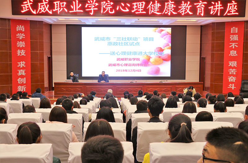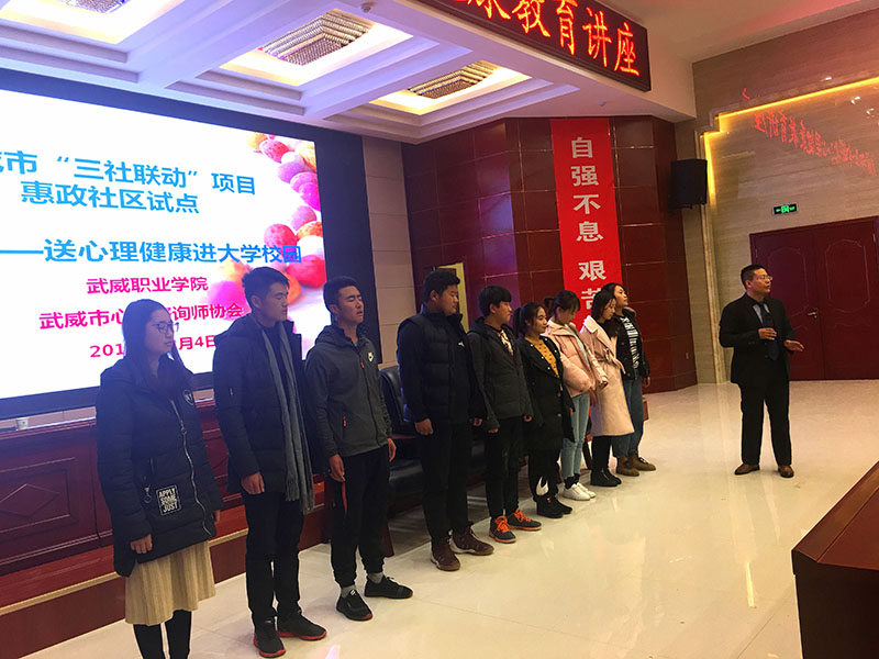 12月4日晚上,學(xué)生工作處聯(lián)合武威市“三社聯(lián)動”惠政社區(qū)試點項目在學(xué)院菁英廳舉辦了心理健康專題講座暨心理信息員培訓(xùn)。此次講座邀請武威市心理咨詢師協(xié)會會長何飛老師主講,學(xué)院各系輔導(dǎo)員、2017級、2018級班級心理信息員、心翼心理社團(tuán)會員等220多人聆聽了講座。學(xué)生工作處處長王守云主持活動。