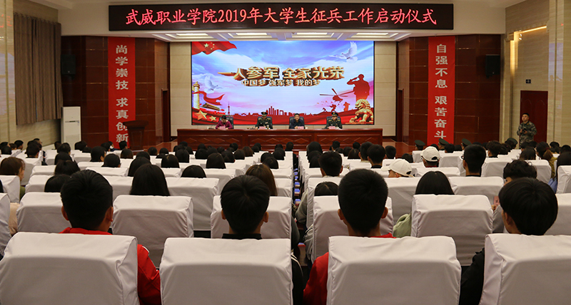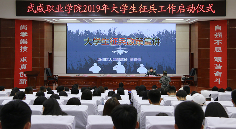 5月9日下午,學(xué)院2019年大學(xué)生征兵工作啟動儀式在大學(xué)生活動中心菁英廳舉行。武威軍分區(qū)司令員、市征兵領(lǐng)導(dǎo)小組副組長張國輝大校,涼州區(qū)人武部部長、涼州區(qū)征兵領(lǐng)導(dǎo)小組副組長兼征兵辦公室主任闞延貴上校,學(xué)院黨委書記、院長趙明,副院長田迎春,武威軍分區(qū)動員處、涼州區(qū)人武部干部,學(xué)院各系黨總支書記、輔導(dǎo)員及學(xué)生代表共計220余人參加了會議。會議由田迎春主持。