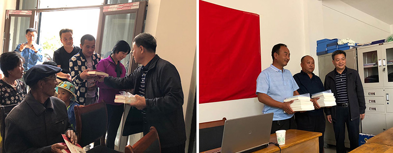 課后,學(xué)院領(lǐng)導(dǎo)把《習(xí)近平新時(shí)代中國(guó)特色社會(huì)主義思想學(xué)習(xí)綱要》《習(xí)近平新時(shí)代中國(guó)特色社會(huì)主義思想三十講》《全國(guó)優(yōu)秀共產(chǎn)黨員風(fēng)采錄》《新時(shí)代黨支部規(guī)范化建設(shè)工作實(shí)用手冊(cè)》和“掃黑除惡”知識(shí)手冊(cè)等14類50多冊(cè)黨建書籍分別贈(zèng)送給蘆草溝村、尚家臺(tái)村黨支部和駐村工作隊(duì),還向聽(tīng)課的村民黨員贈(zèng)送《習(xí)近平的七年知青歲月》等書籍。進(jìn)村入戶的幫扶干部向幫扶戶村民黨員贈(zèng)送了黨建書籍。共贈(zèng)送100多冊(cè)價(jià)值2700多元黨建書籍和掃黑除惡手冊(cè)。