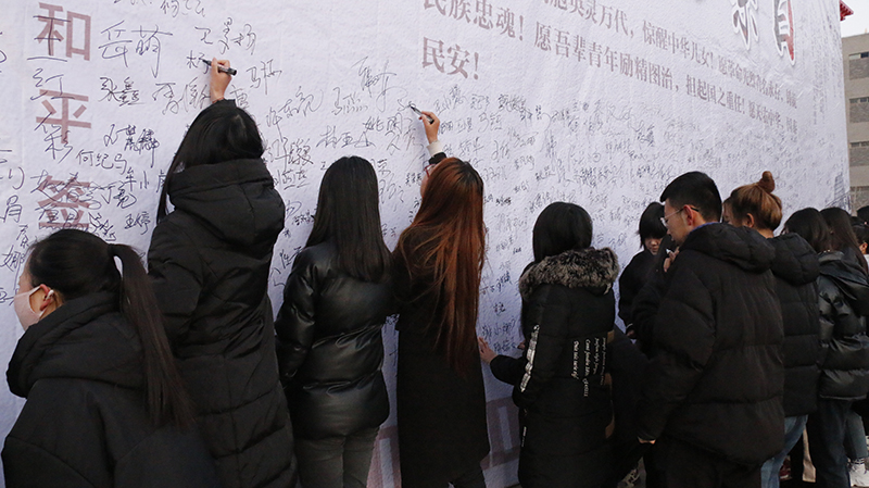 活動最后,參會師生在紀念背景墻上簽名,共同祈愿: