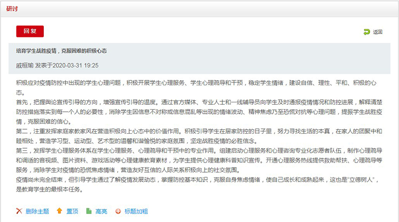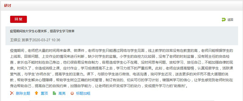 學生工作處教師姚斌表示,本次培訓對輔導員角色定位及工作職責有了更深一步的認知,對開展疫情防控工作、提升危機處理能力、守護學生身心健康起到指導作用,能幫助我們及時掌握特殊時期學生思想特點和行為特征,指導今后的工作。