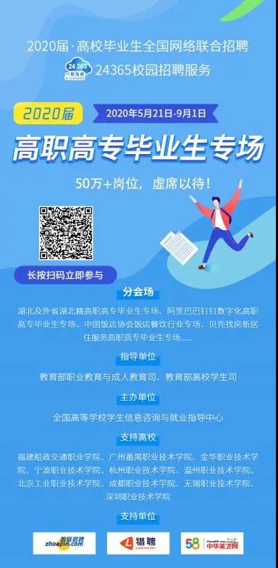 為了進(jìn)一步促進(jìn)2020屆高職高專畢業(yè)生就業(yè),教育部高校學(xué)生司和職業(yè)教育與成人教育司聯(lián)合推出“高職高專畢業(yè)生專場招聘會”,首批推出崗位超過50萬個(gè)。畢業(yè)生可登錄教育部大學(xué)生就業(yè)網(wǎng)(新職業(yè)網(wǎng)www.ncss.cn)或直接掃描宣傳頁中的二維碼參與活動(dòng)。