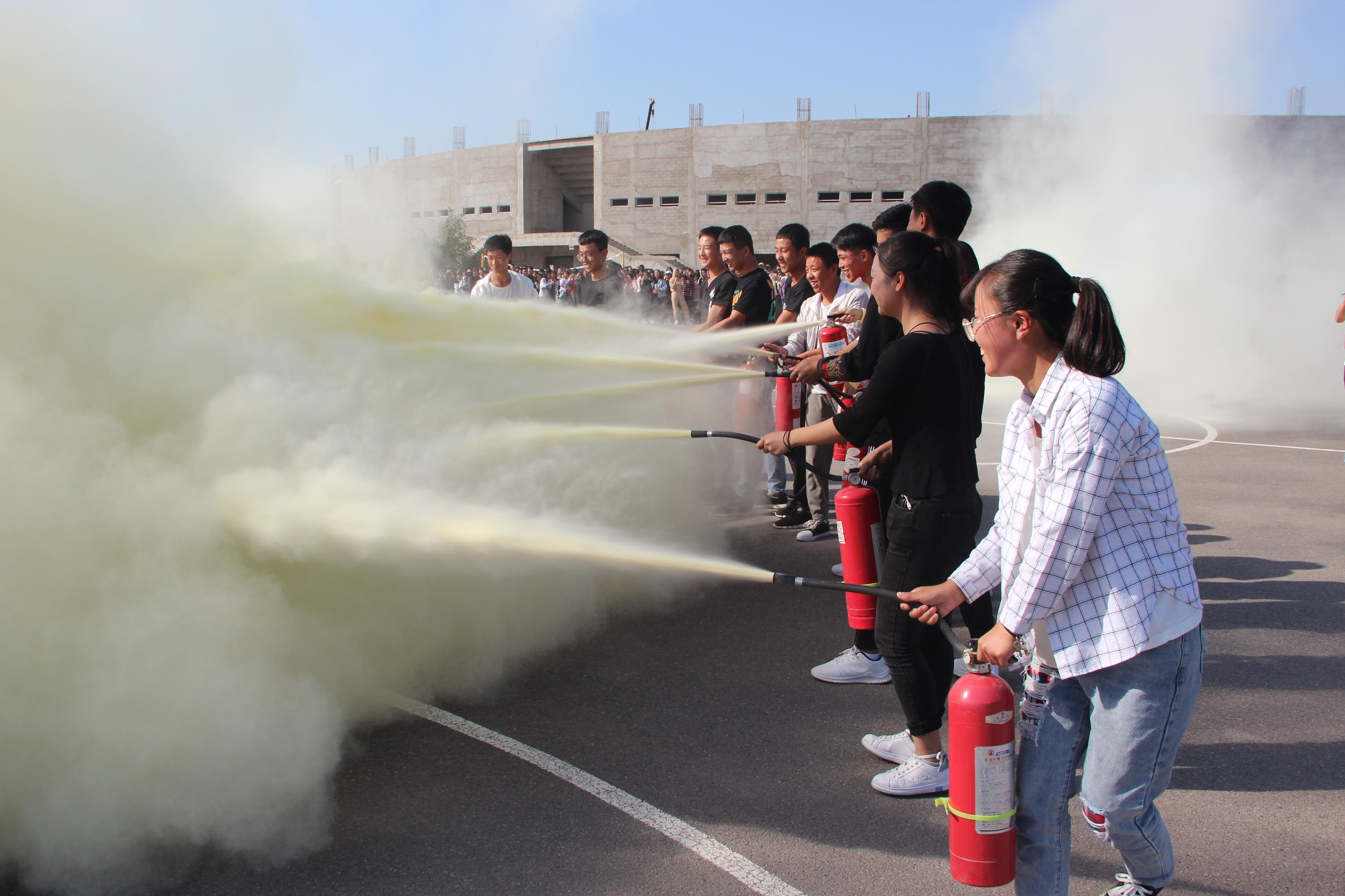隨后,2019級新生整隊到操場參加了滅火演練。在消防隊員的講解和示范下,同學(xué)們現(xiàn)場學(xué)習(xí)了應(yīng)急逃生和消防安全常識,部分師生代表、食堂工作人員親身體驗了處置滅火器著火液化氣瓶、干粉滅火、通過模擬煙室逃生等操作。