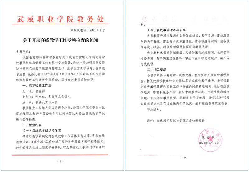 各院系及相關(guān)部門要按照教育部和省教育廳關(guān)于疫情防控期間在線教學(xué)工作的文件精神和《武威職業(yè)學(xué)院新型冠狀病毒肺炎疫情防控期間在線教學(xué)工作實(shí)施方案》的相關(guān)要求進(jìn)行全面自查,做到文件精神及要求全部落實(shí)到位、不打折扣;對(duì)執(zhí)行情況進(jìn)行認(rèn)真總結(jié),通過自查深入挖掘現(xiàn)階段在線教學(xué)實(shí)施和組織管理過程中的重點(diǎn)問題,利用各系教研活動(dòng)和教研團(tuán)隊(duì)推動(dòng)開展教學(xué)研究和人才培養(yǎng)模式改革研究,全面落實(shí)問題導(dǎo)向,推動(dòng)在線教學(xué)工作落實(shí)落細(xì)落地。