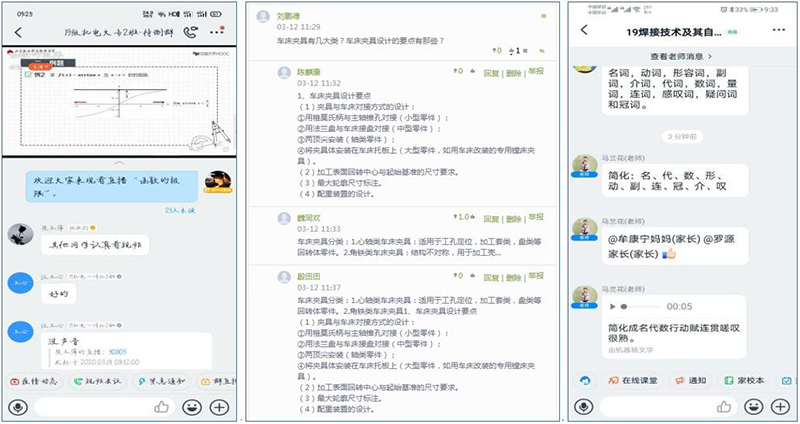 機(jī)械制造系和電信系的教師在課后積極收集學(xué)生的提問或者疑難問題,利用課余或周末的時(shí)間,在家中通過白板講解、紙筆講解的方式利用釘釘群直播講解練習(xí)題,開展互動(dòng)答疑。
