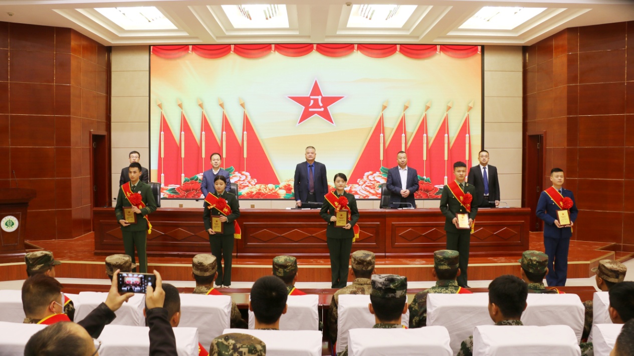 大會上,高鵬堂宣讀了2021年春季入伍學(xué)生名單和近兩年退役復(fù)學(xué)學(xué)生名單;參會領(lǐng)導(dǎo)為應(yīng)征入伍的12名新兵佩戴紅花,贈送紀(jì)念品,為退役復(fù)學(xué)學(xué)生代表佩戴紅花,頒發(fā)榮譽證書。