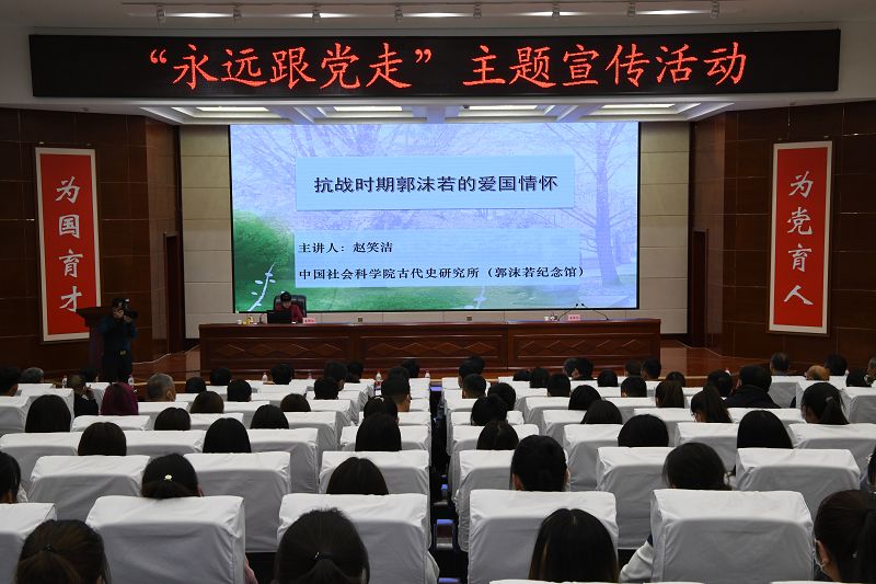 5月21日,中國(guó)社會(huì)科學(xué)院古代史研究所黨委書(shū)記、郭沫若紀(jì)念館原館長(zhǎng)趙笑潔來(lái)學(xué)院作《抗戰(zhàn)時(shí)期郭沫若的愛(ài)國(guó)情懷》專題講座,學(xué)院在家院領(lǐng)導(dǎo)、副科級(jí)以上干部、師生代表共計(jì)220人聆聽(tīng)了講座。