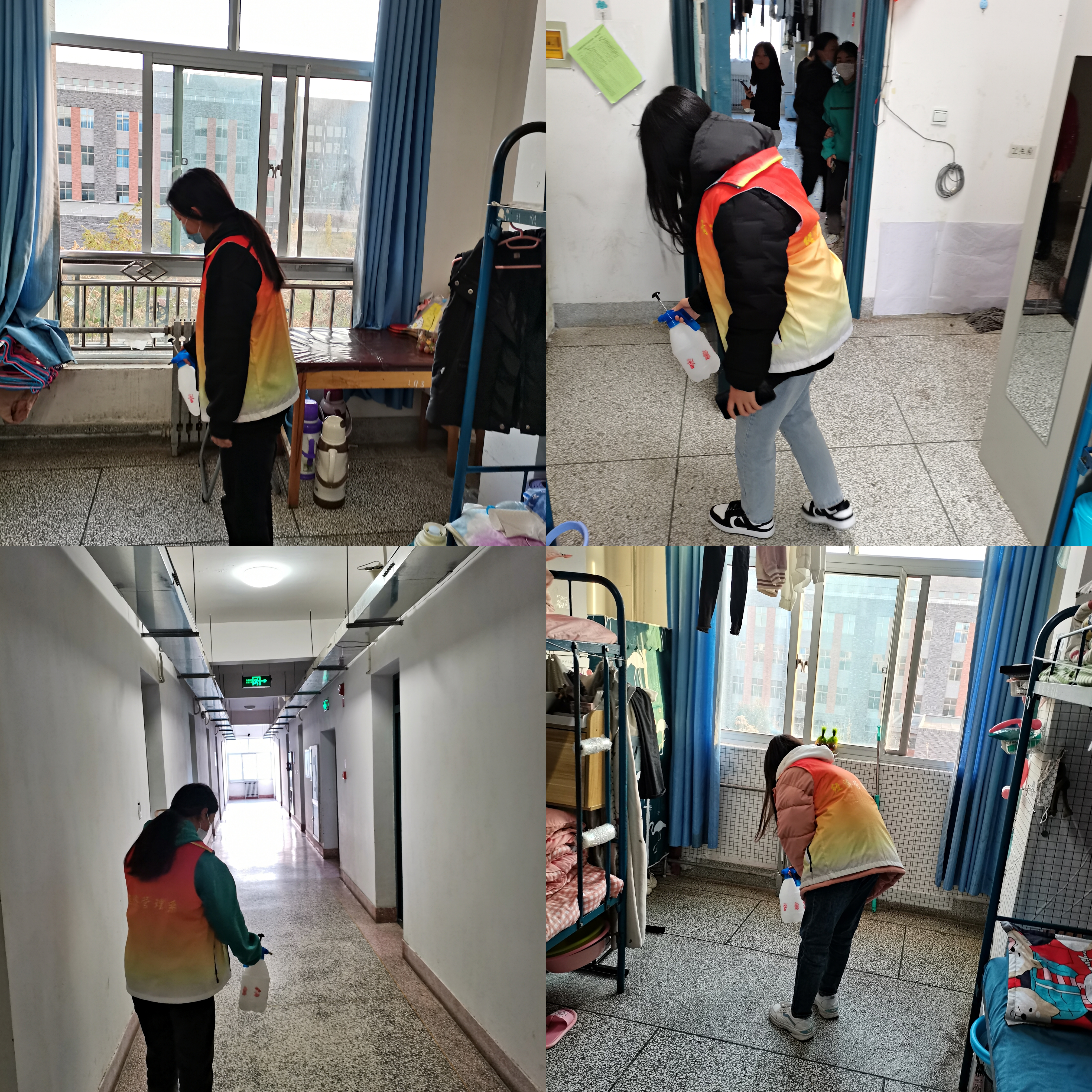 為切實抓好宿舍及公共區(qū)域防控消殺工作,營造安全舒適的學(xué)習(xí)生活環(huán)境,志愿者協(xié)會根據(jù)不同職能劃分為7個小組,按照“一天兩次”消殺頻率持續(xù)對經(jīng)緯樓、3號學(xué)生公寓等宿舍樓內(nèi)的學(xué)生宿舍進行通風(fēng)消毒工作,重點對宿舍地面、床底、門角處等位置進行全方位、多角度消毒,盡量做到消殺不留死角。同時,志愿者還通過網(wǎng)絡(luò)平臺學(xué)習(xí)疫情防控措施相關(guān)知識,并在消殺過程中為同學(xué)們普及疫情防控知識,全面加強宣傳引導(dǎo),幫助廣大師生在第一時間了解防疫資訊,有效杜絕謠言傳播,確保廣大師生情緒穩(wěn)定。