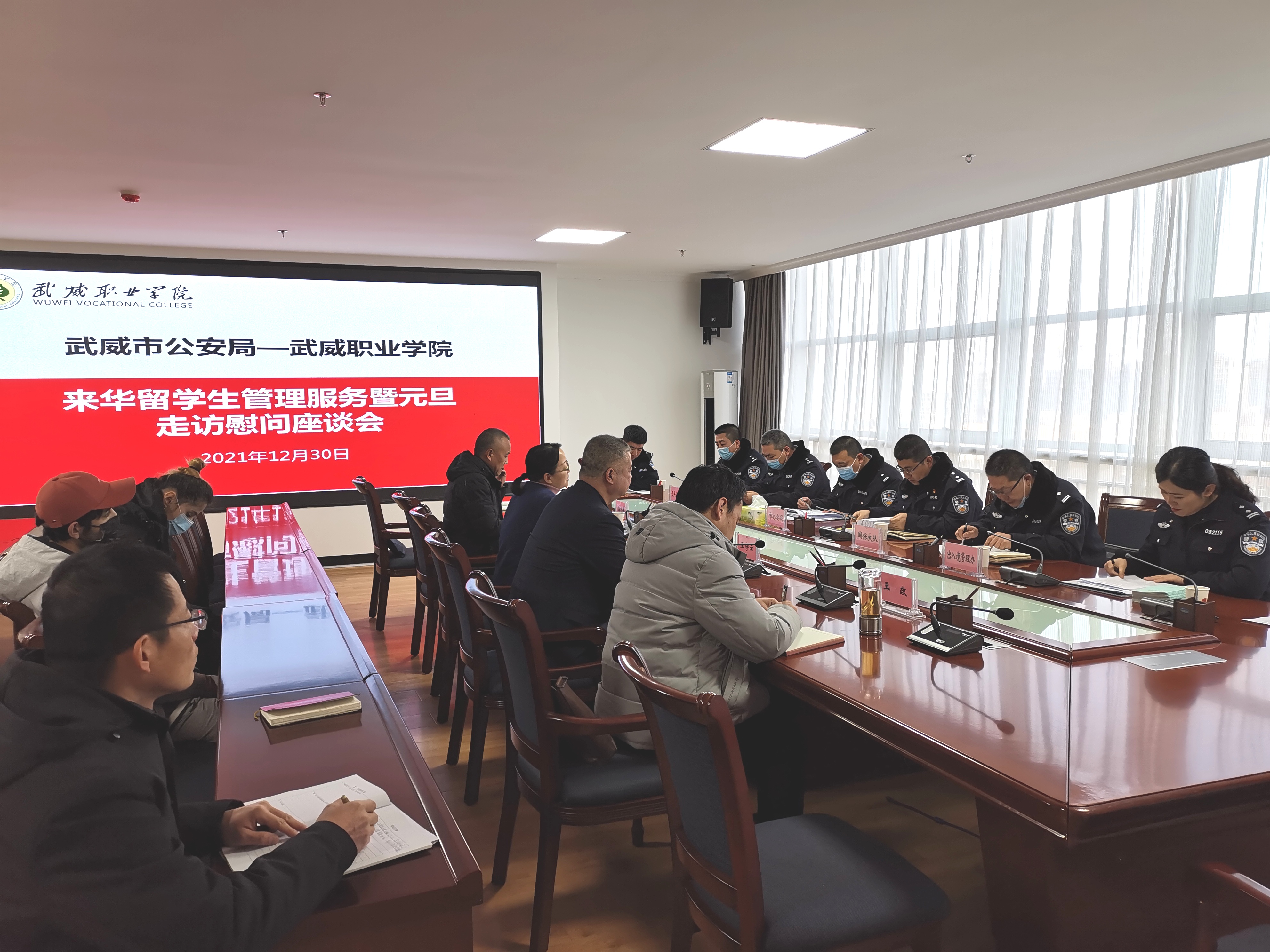 12月30日上午,市公安局出入境管理科、非政府組織管理辦公室,市公安局涼州分局國(guó)安大隊(duì)、反恐大隊(duì)、出入境管理辦公室、涼州分局西關(guān)街派出所一行十一人到訪學(xué)院,開(kāi)展來(lái)華留學(xué)生管理服務(wù)暨元旦走訪慰問(wèn)活動(dòng)。黨委委員、副院長(zhǎng)田迎春、王守云出席活動(dòng)。國(guó)際合作與交流處處長(zhǎng)潘從民、保衛(wèi)處處長(zhǎng)王政及相關(guān)人員,2019級(jí)、2021級(jí)在華留學(xué)生參加活動(dòng)。田迎春主持活動(dòng)。