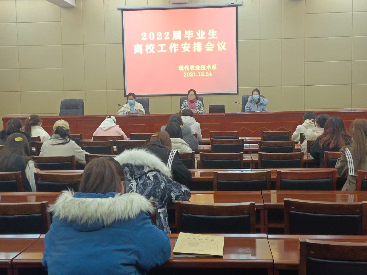 為確保2022屆畢業(yè)生離校工作安全穩(wěn)定、平安有序地進(jìn)行,12月24日上午,現(xiàn)代農(nóng)業(yè)技術(shù)系黨總支書記晏素珍在行樹樓北側(cè)報(bào)告廳組織召開2022屆畢業(yè)生離校工作安排會(huì)議,畢業(yè)班班主任和全體畢業(yè)生參加了會(huì)議。