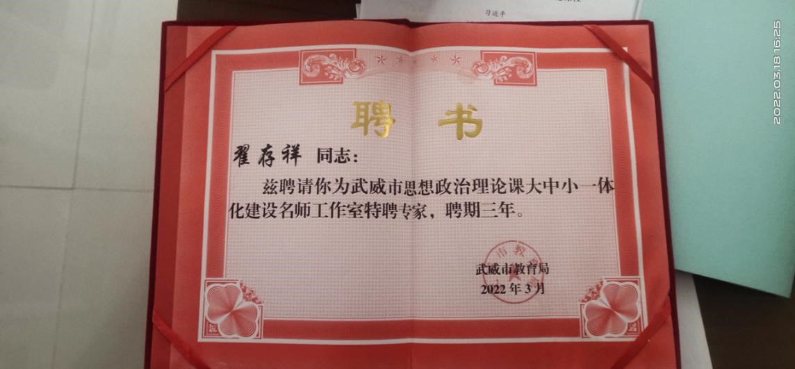 會(huì)議學(xué)習(xí)了習(xí)近平總書(shū)記在學(xué)校思想政治理論課教師座談會(huì)上的重要講話精神,總結(jié)了近年來(lái)武威市思政課建設(shè)取得的成績(jī),各縣區(qū)交流了經(jīng)驗(yàn)做法,安排部署了下一階段工作。同時(shí),舉行了武威市思想政治理論課大中小一體化建設(shè)名師工作室授牌和名師工作室特聘專(zhuān)家聘任儀式。學(xué)校思政課名師工作室負(fù)責(zé)人、黨委副書(shū)記翟存祥教授被聘為武威市思想政治理論課大中小一體化建設(shè)名師工作室特聘專(zhuān)家。