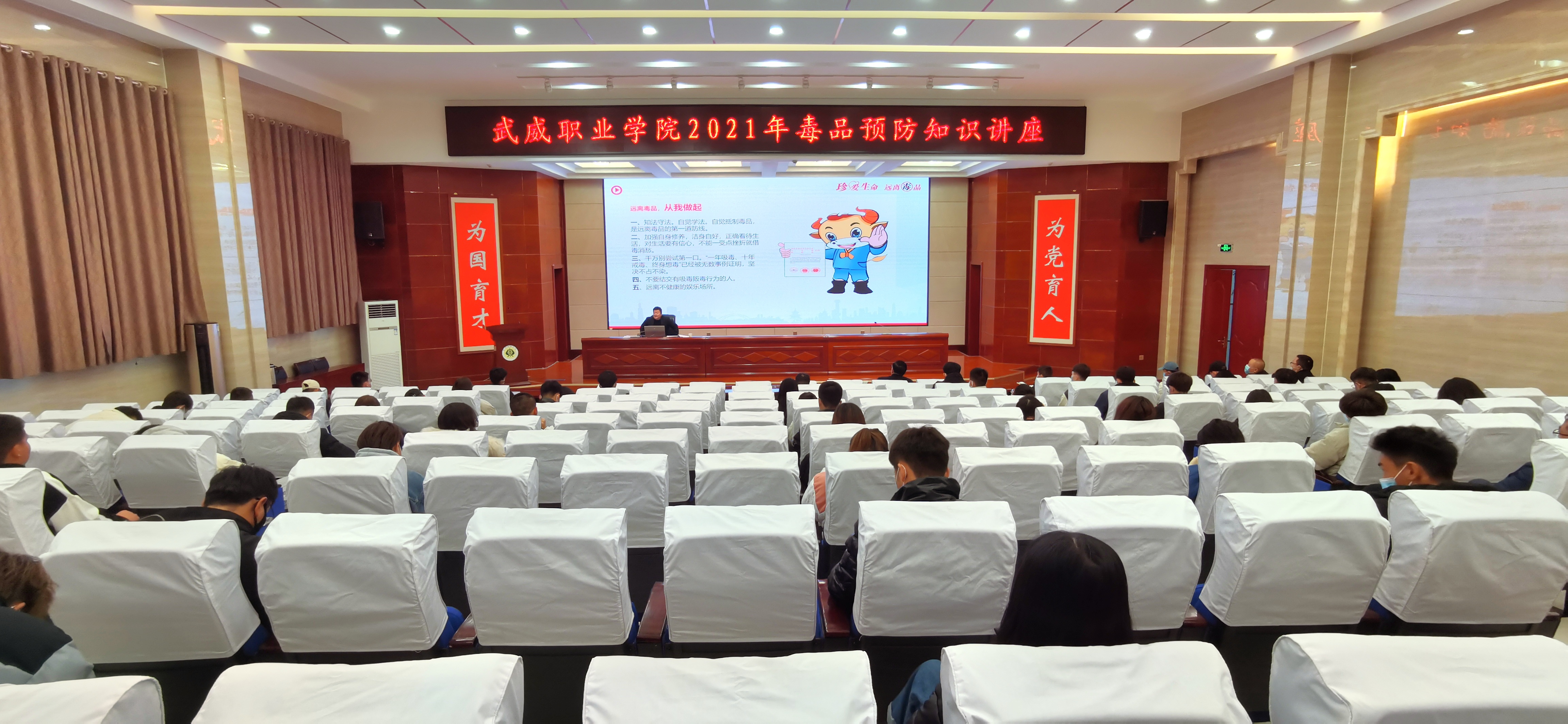 12月23日下午,學(xué)院邀請市禁毒委副主任、市政府副秘書長魯學(xué)才在菁英廳作了題為“健康人生,綠色無毒”毒品預(yù)防知識講座,學(xué)院副院長張開禮、武威市公安局禁毒支隊政委杜興林與師生一起聆聽了講座。