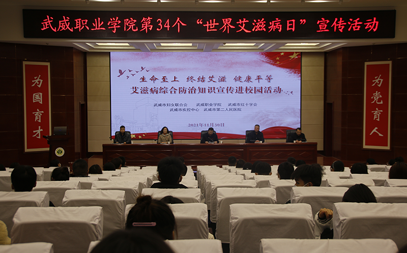 11月30日,學(xué)院在菁英廳開展了“生命至上 終結(jié)艾滋 健康平等”艾滋病綜合防治知識宣傳進(jìn)校園活動。市疾控中心工會主席張富國、市婦聯(lián)副主席張惠華、學(xué)院黨委委員、副院長王守云,市第二人民醫(yī)院院長滕亮出席活動,活動由學(xué)院護(hù)理系黨總支書記張建輝主持,市紅十字會、市疾控中心、天馬行市民云數(shù)據(jù)有限公司工作人員及武威職業(yè)學(xué)院師生代表參加活動。