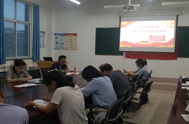6月6日晚,現(xiàn)代農(nóng)業(yè)學(xué)院(鄉(xiāng)村振興學(xué)院)組織召開(kāi)專題會(huì)議,學(xué)習(xí)新修訂的《中華人民共和國(guó)職業(yè)教育法》(以下簡(jiǎn)稱《職業(yè)教育法》)。會(huì)議由學(xué)院黨總支書記晏素珍主持,院長(zhǎng)金玉龍及全體教師參加了此次學(xué)習(xí)。