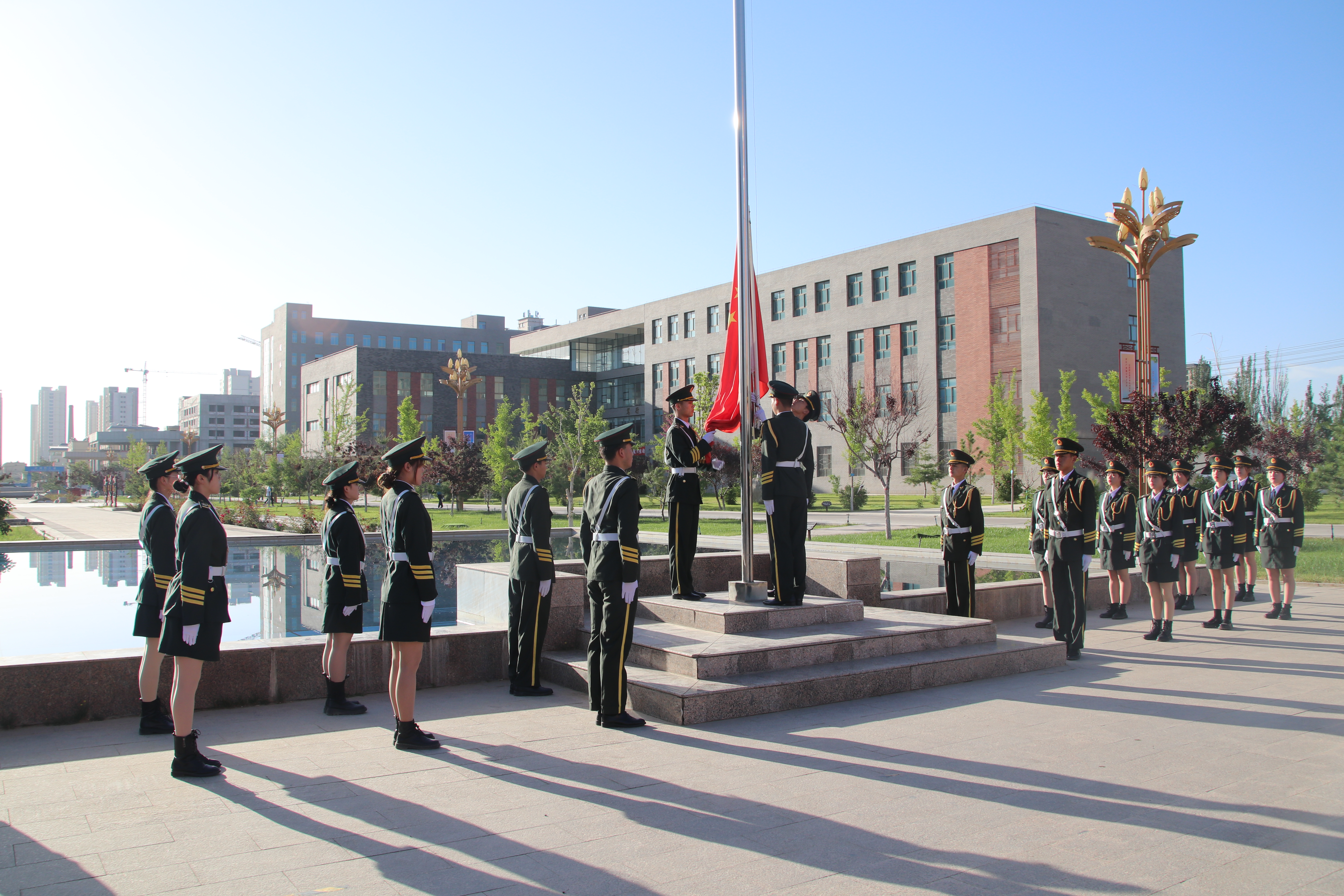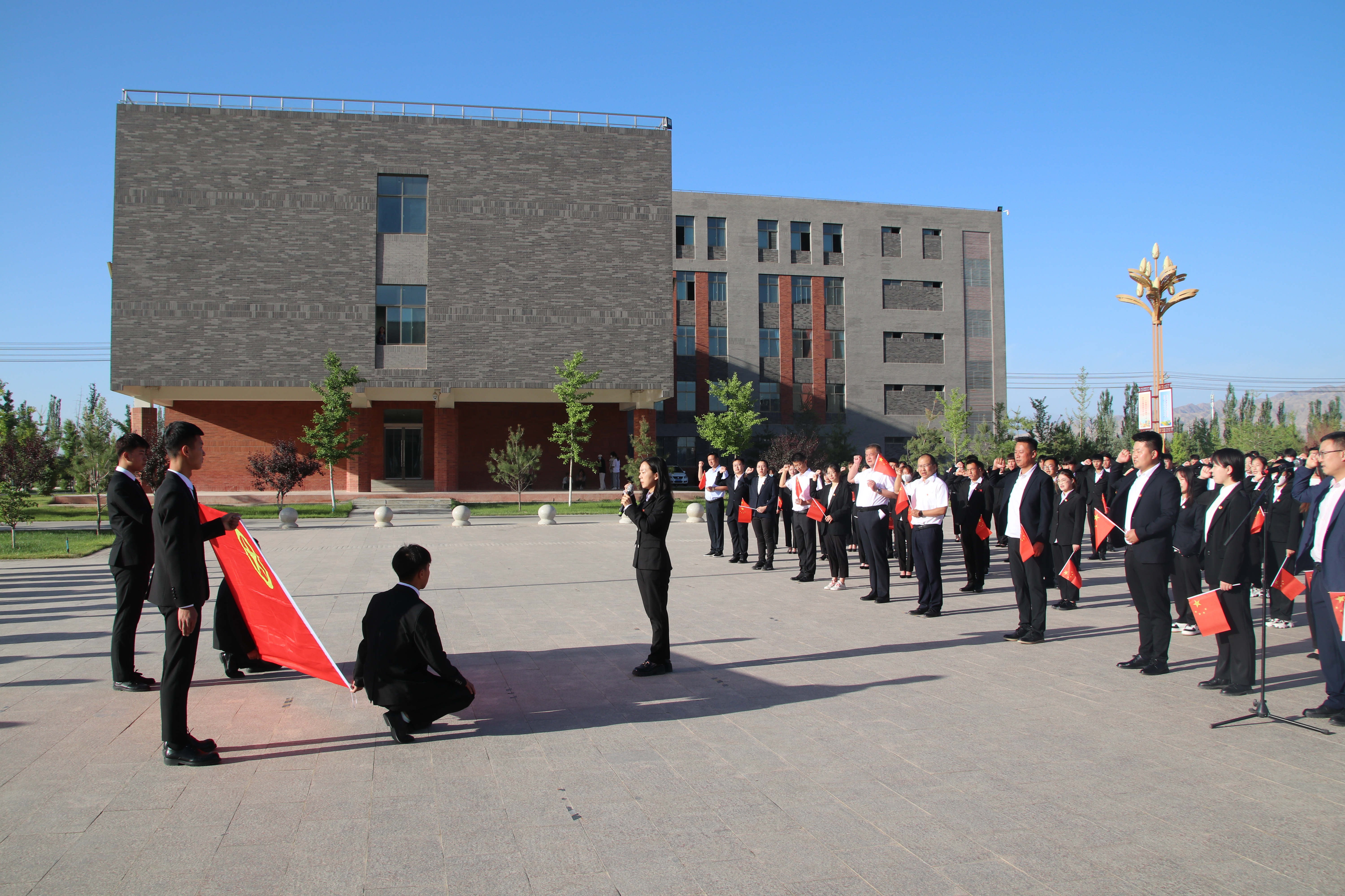 迎著朝陽(yáng),五星紅旗在國(guó)旗護(hù)衛(wèi)隊(duì)的護(hù)送下緩緩入場(chǎng),昂昂國(guó)歌奏響,國(guó)旗迎風(fēng)飄揚(yáng),全場(chǎng)師生齊唱國(guó)歌。學(xué)生代表在國(guó)旗下致獻(xiàn)詞,對(duì)黨許下青春的誓言,獻(xiàn)詞之后舉行了嚴(yán)肅莊重的重溫入團(tuán)誓詞儀式,增強(qiáng)了共青團(tuán)員的組織光榮感和歸屬感,激發(fā)了團(tuán)員青年的使命感和責(zé)任感。最后,全體團(tuán)員青年齊唱《共青團(tuán)團(tuán)歌》,用響亮的歌聲表達(dá)建團(tuán)百年再出發(fā)的祝福,現(xiàn)場(chǎng)愛(ài)國(guó)熱情持續(xù)高漲。