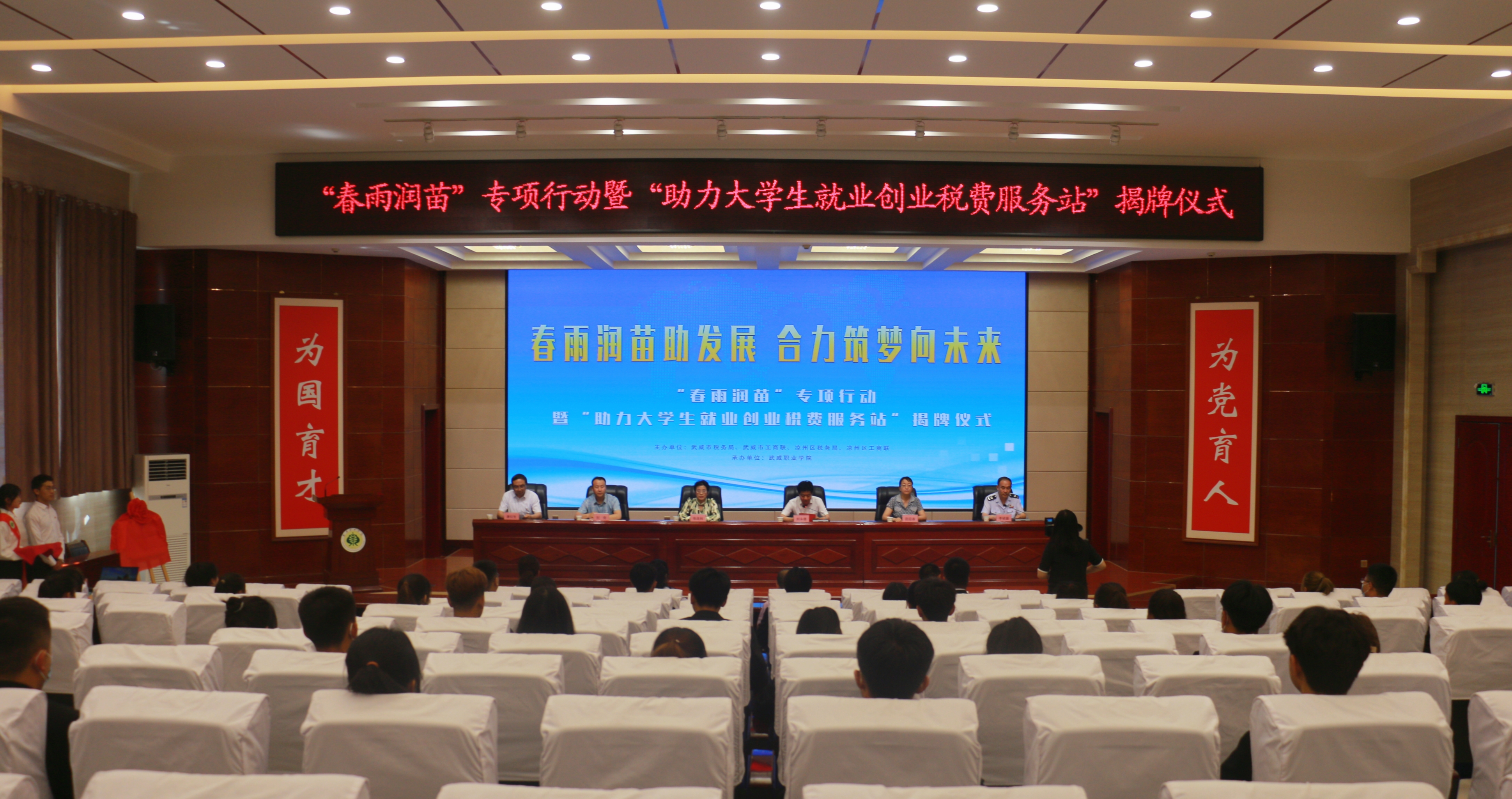 6月10日下午,武威市稅務(wù)局聯(lián)合工商聯(lián)在學(xué)校菁英廳舉辦“春雨潤(rùn)苗”專項(xiàng)行動(dòng)暨“助力大學(xué)生就業(yè)創(chuàng)業(yè)稅費(fèi)服務(wù)站”揭牌儀式。武威市稅務(wù)局黨委委員、副局長(zhǎng)劉永德,武威市工商聯(lián)副主席張連科,涼州區(qū)工商聯(lián)副主席唐紅生,學(xué)校黨委委員、副校長(zhǎng)田迎春出席揭牌儀式,涼州區(qū)稅務(wù)局黨委委員、副局長(zhǎng)李斌盛主持活動(dòng)。武威市稅務(wù)局黨委委員、副局長(zhǎng)劉永德在講話中指出“助力大學(xué)生就業(yè)創(chuàng)業(yè)稅費(fèi)服務(wù)站”的成立,既是武威稅務(wù)部門優(yōu)化稅費(fèi)服務(wù)的有力舉措,也是學(xué)院、工商聯(lián)和稅務(wù)的一次深入合作,更是三方匯聚合力,助力穩(wěn)就業(yè)、保民生、促發(fā)展的積極作為?!?/p>