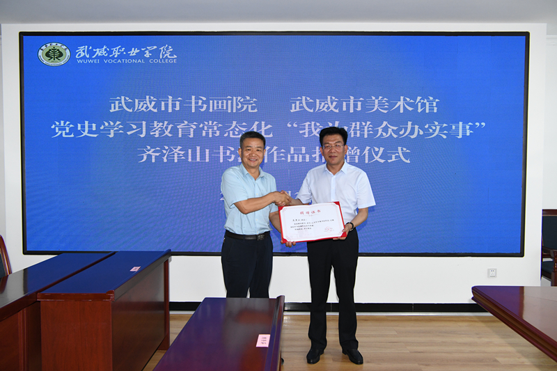 此次捐贈(zèng)儀式既是學(xué)校加強(qiáng)校園文化建設(shè)的重要舉措,也是黨史學(xué)習(xí)教育常態(tài)化“我為群眾辦實(shí)事”的具體體現(xiàn),學(xué)校將進(jìn)一步加強(qiáng)與市書畫院、美術(shù)館的文化藝術(shù)交流,傳承和弘揚(yáng)中華優(yōu)秀傳統(tǒng)文化,提升校園文化軟實(shí)力,加強(qiáng)師生美育教育,以德潤(rùn)心,以文化人,推動(dòng)學(xué)?!半p高計(jì)劃”建設(shè),全力以赴申辦武威職業(yè)技術(shù)大學(xué)。