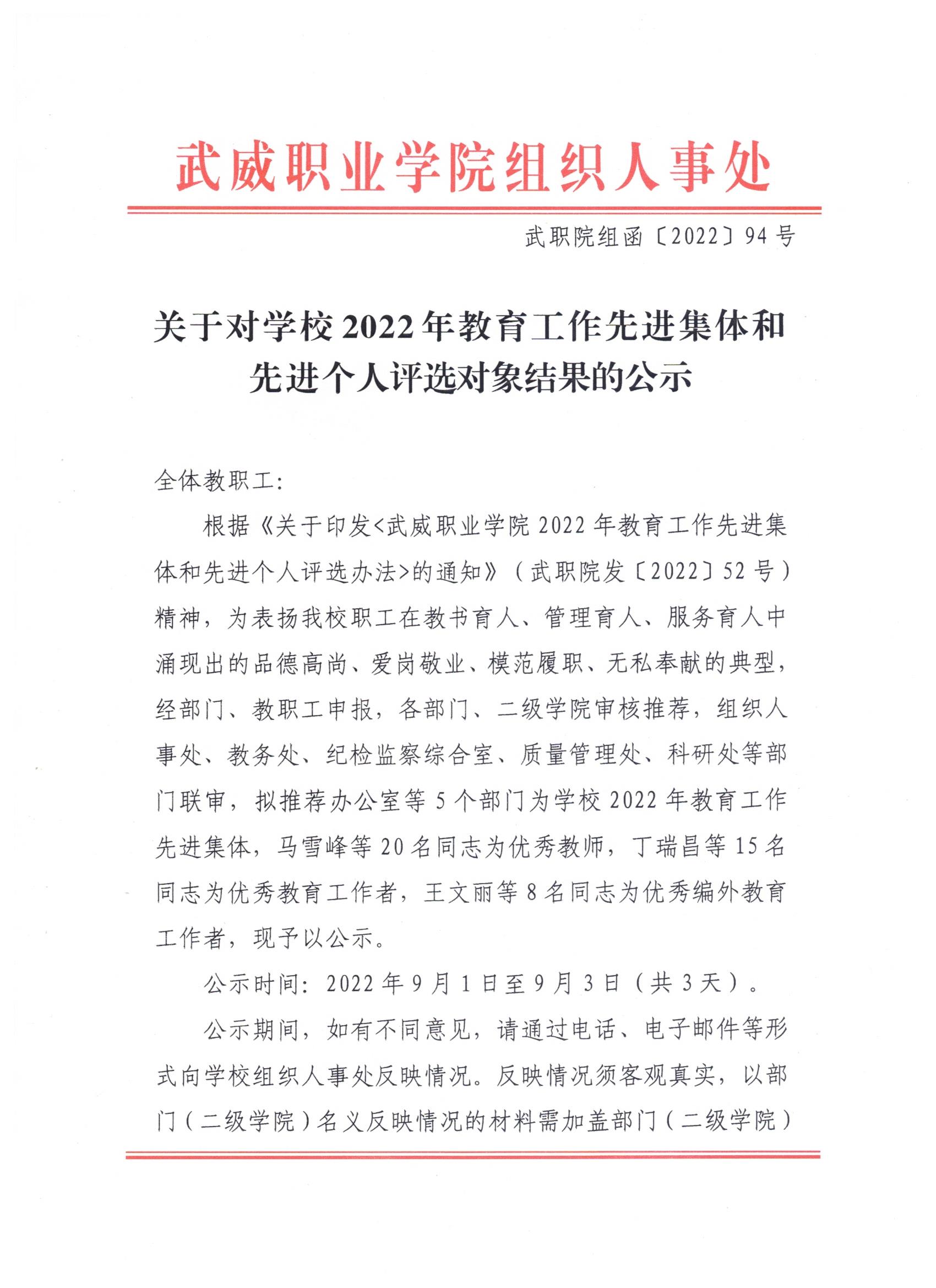 關(guān)于對(duì)學(xué)校2022年教育工作先進(jìn)集體和先進(jìn)個(gè)人評(píng)選對(duì)象結(jié)果的公示
