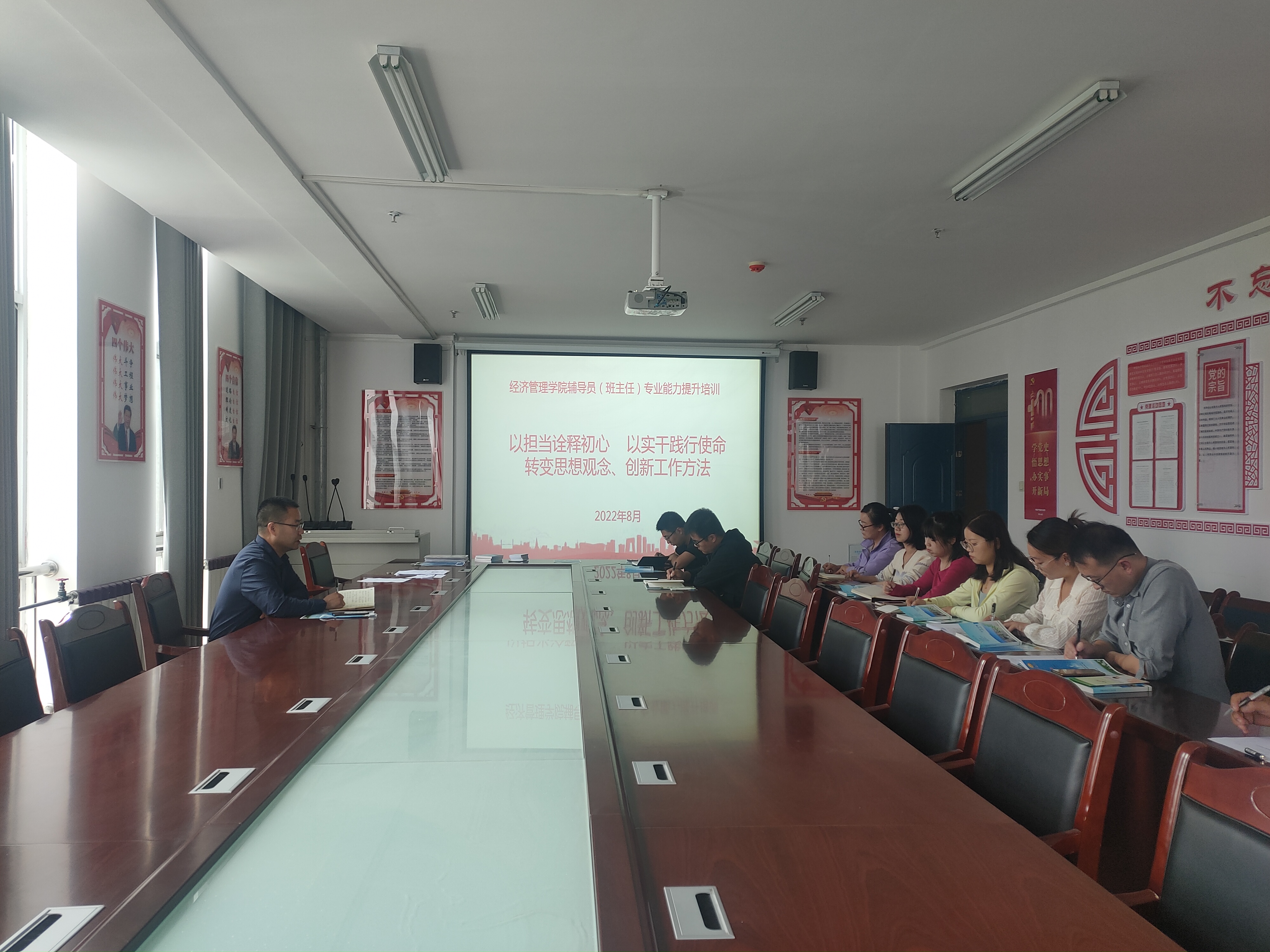 為提高學生管理水平,提升班主任隊伍整體素質,經濟管理學院于8月30日在經緯樓306會議室召開了“以擔當詮釋初心 以實干踐行使命---——轉變思想觀念、創(chuàng)新工作方法”為主題的班主任專業(yè)能力提升培訓會。會議由經濟管理學院黨總支書記張伯成主持,全體班主任、輔導員參加了本次會議。