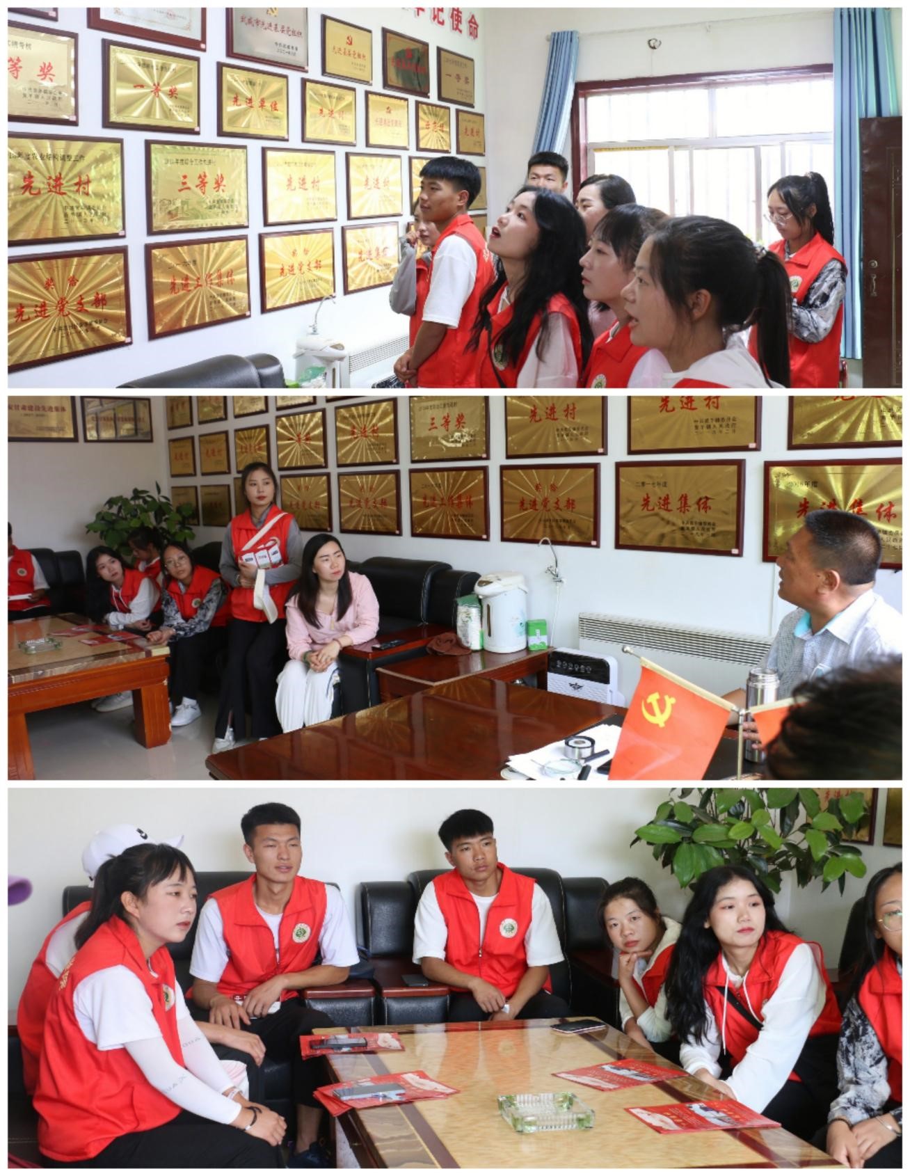 走進(jìn)楊斌書記的辦公室,全體成員的眼球都被掛滿墻面的那數(shù)十塊獎(jiǎng)牌所吸引。從縣區(qū)到市級到省級再到國家級,每一塊獎(jiǎng)牌都承載著上莊村全體村民的努力和汗水,凝結(jié)著楊斌書記和村干部的勇氣和決心。