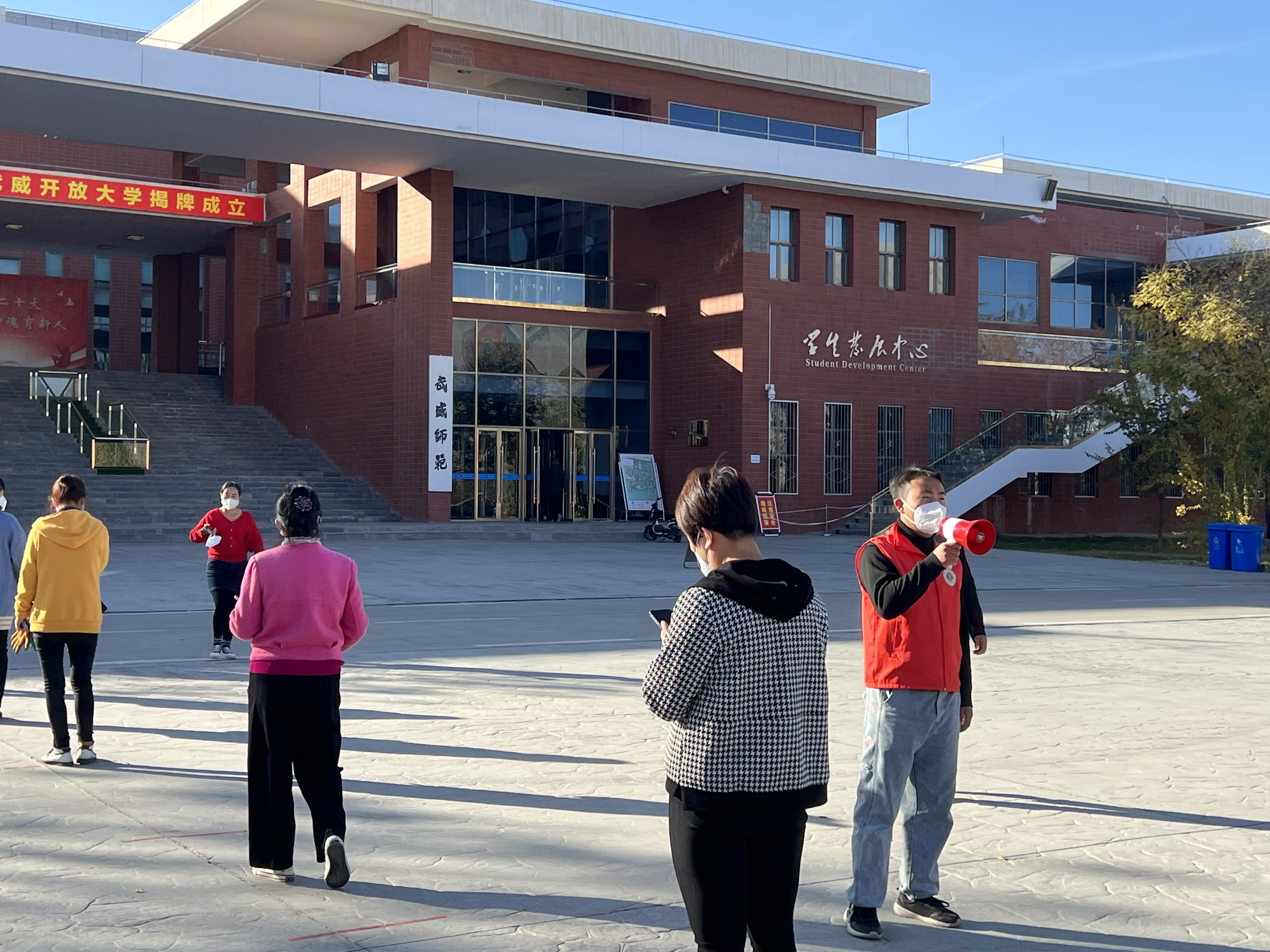 “您好,請(qǐng)測(cè)量體溫、掃場(chǎng)所碼?!薄罢?qǐng)佩戴好口罩,有序排隊(duì)……”校學(xué)生會(huì)的陶玲在學(xué)校食堂門口值班時(shí)不停地提醒著進(jìn)出打飯的同學(xué)們,這也是她參加校園疫情防控以來每天講得最多的話。自10月13日涼州區(qū)實(shí)施臨時(shí)管控以來,學(xué)校各學(xué)生組織聞令而動(dòng),身穿“藍(lán)馬甲”積極投身校園疫情防控一線,用奉獻(xiàn)溫暖了這個(gè)秋天。