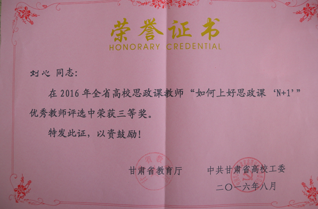 根據(jù)《甘肅省教育廳 中共甘肅省高校工委關(guān)于開展“如何上好思政課‘N+1’”優(yōu)秀教師評選活動的通知》要求,我系劉心教師積極參加,最終喜獲由甘肅省教育廳 中共甘肅省高校工委頒發(fā)的在2016年全省高校思政課教師“如何上好思政課‘N+1’”優(yōu)秀教師評選中榮獲三等獎(jiǎng)。