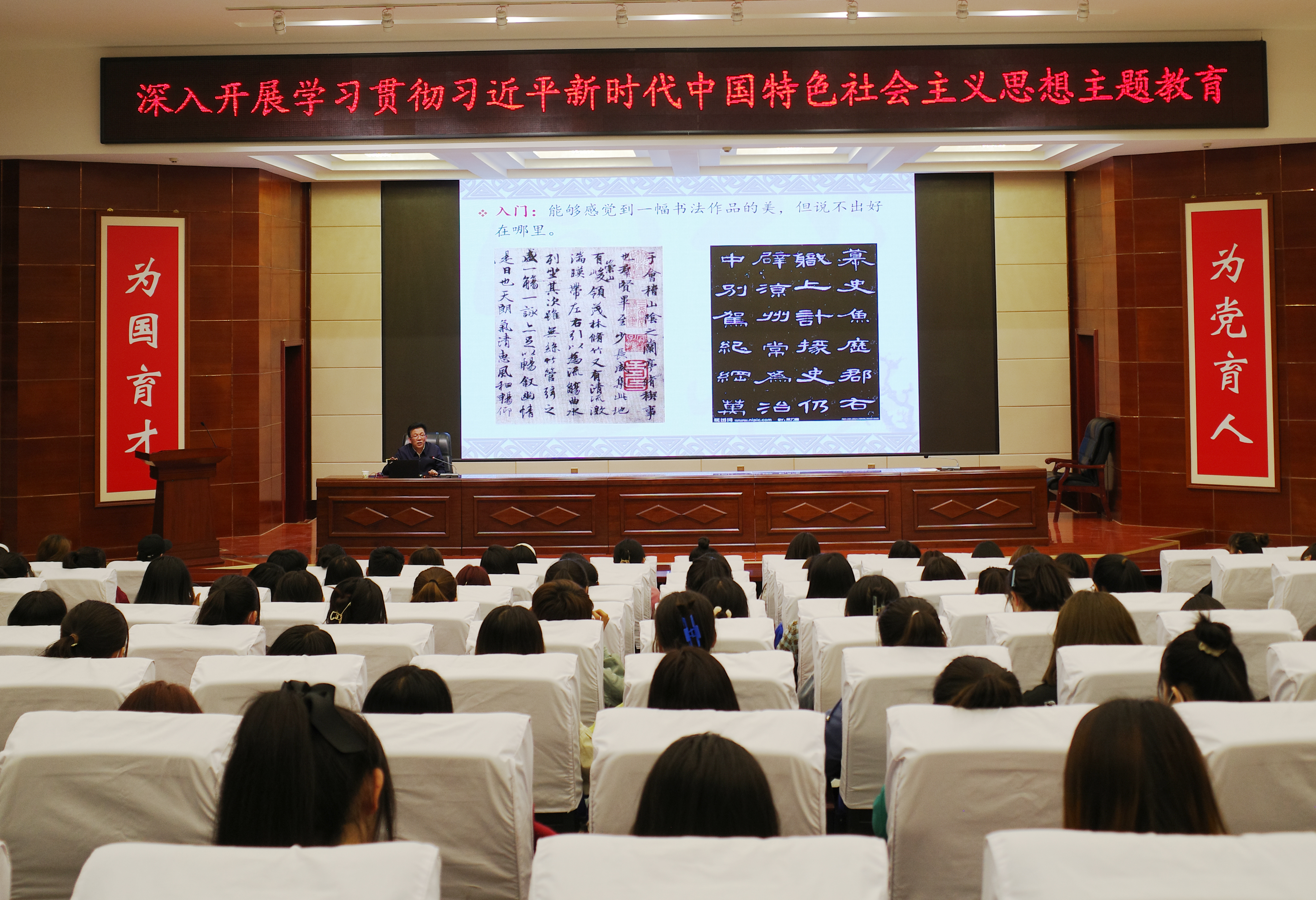活動(dòng)中,齊澤山在菁英廳為師生做了題為“如何欣賞書法作品”專題講座,他介紹了中國書法藝術(shù)的起源、傳統(tǒng)、特點(diǎn),以《蘭亭序》《曹全碑》等多幅經(jīng)典書法作品為例,深入解析了書法藝術(shù)的魅力與內(nèi)涵,清晰呈現(xiàn)了中國書法悠久的歷史脈絡(luò),使師生們對(duì)中國書法藝術(shù)的起源與發(fā)展有了更加深刻地理解。講座引經(jīng)據(jù)典、風(fēng)趣幽默、親切自然,讓師生在輕松愉悅的氛圍中升華了對(duì)書法藝術(shù)的審美感受。師生們紛紛表示,此次講座是一次難得的學(xué)習(xí)機(jī)會(huì),受益匪淺,對(duì)中國書法藝術(shù)有了更深入、更全面的了解。