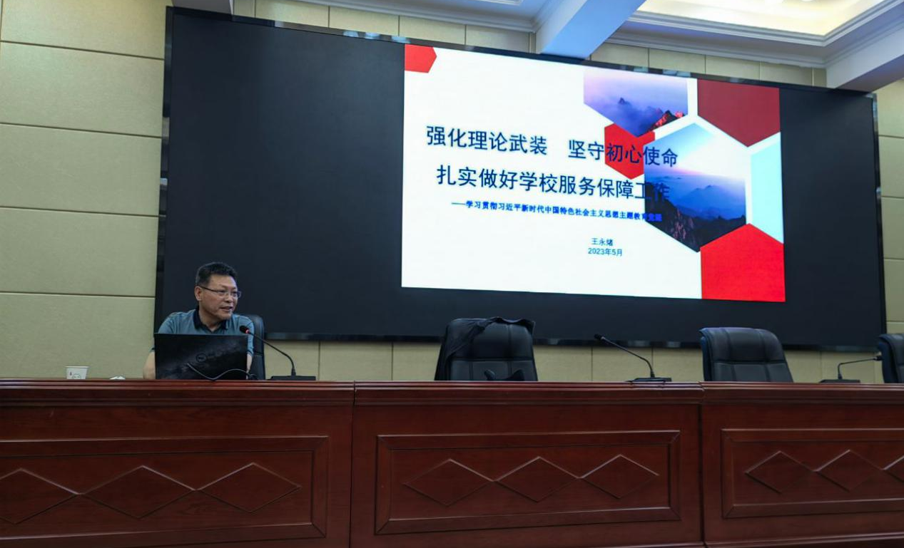 5月30日,學(xué)校黨委委員、副校長王永緒以《強化理論武裝?堅守初心使命——扎實做好學(xué)校服務(wù)保障工作》為題,在學(xué)校行樹樓北側(cè)學(xué)術(shù)報告廳講授學(xué)習(xí)貫徹習(xí)近平新時代中國特色社會主義思想主題教育專題黨課。后勤管理處黨員、干部職工參加黨課學(xué)習(xí)。