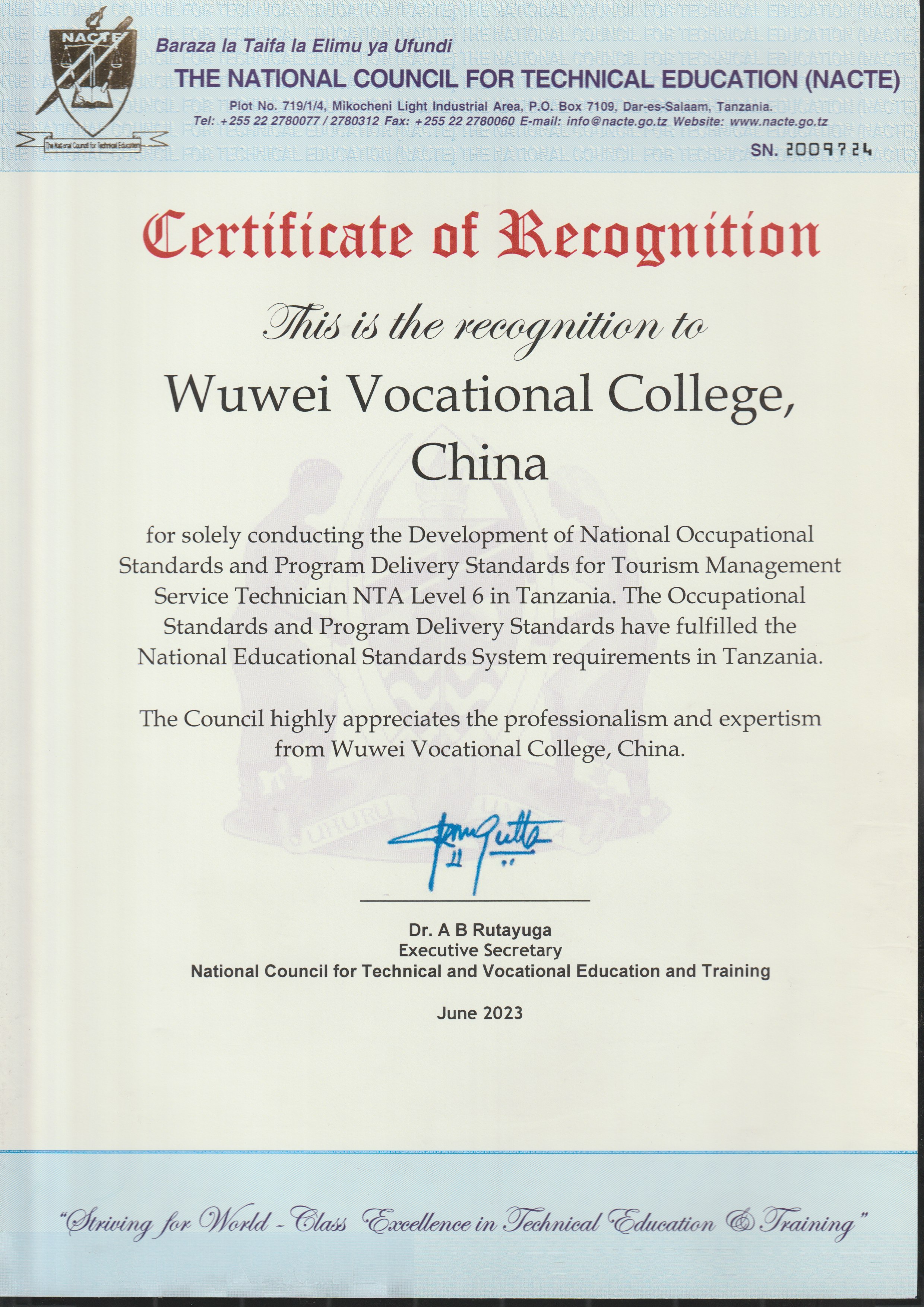 6月16日,學(xué)校獨(dú)立開發(fā)制定的旅游管理服務(wù)技術(shù)員6級(jí)職業(yè)標(biāo)準(zhǔn)和配套專業(yè)教學(xué)標(biāo)準(zhǔn)通過了坦桑尼亞國家職業(yè)教育委員會(huì)審核,獲得認(rèn)證,正式納入坦桑尼亞國家職業(yè)教育體系。旅游管理服務(wù)技術(shù)員6級(jí)職業(yè)標(biāo)準(zhǔn)和配套專業(yè)教學(xué)標(biāo)準(zhǔn)由學(xué)校經(jīng)濟(jì)管理學(xué)院旅游管理專業(yè)教師許春華、占發(fā)禹、張語悅、王美婕、閆亞旗、劉金萍六位教師共同開發(fā)制定。