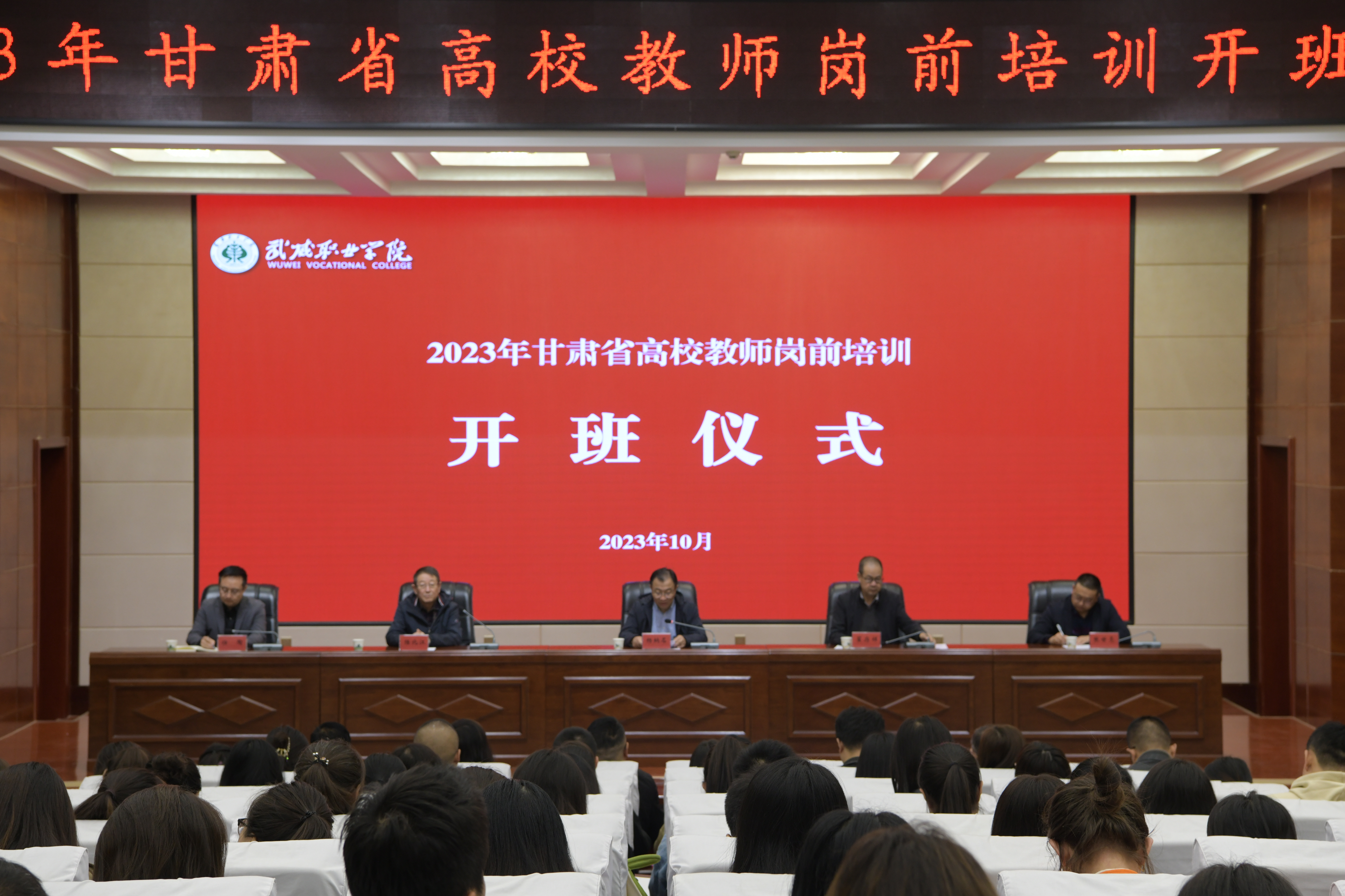 為深入學(xué)習(xí)貫徹習(xí)近平總書記教師節(jié)重要指示精神,引導(dǎo)廣大教師深刻領(lǐng)會(huì)教育家精神,牢記“為黨育人、為國(guó)育才”初心使命,樹立躬耕教壇信念,培養(yǎng)高素質(zhì)教師隊(duì)伍,10月14日上午,我校2023年新教師崗前培訓(xùn)教學(xué)班開班儀式暨第一階段集中培訓(xùn)在學(xué)生發(fā)展中心菁英廳舉行。西北師范大學(xué)繼續(xù)教育學(xué)院院長(zhǎng)、甘肅省高等學(xué)校師資培訓(xùn)中心辦公室主任楊納名,武威職業(yè)學(xué)院黨委副書記翟存祥出席會(huì)議并講話,組織人事處、教務(wù)處負(fù)責(zé)人和180位新教師參加開班儀式。儀式由甘肅省高等學(xué)校師資培訓(xùn)中心副主任陸北江主持。