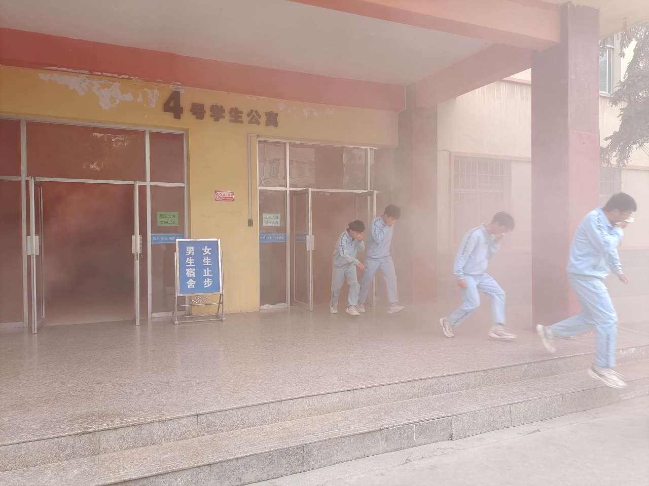 14時40分,疏散演練正式開始。隨著火災(zāi)警報響起,各學(xué)生公寓樓冒出滾滾濃煙,公寓管理人員迅速組織學(xué)生有序疏散。在軍訓(xùn)教官、學(xué)生管理人員的引導(dǎo)下,同學(xué)們按照動作要領(lǐng),用濕毛巾捂住口鼻,俯身彎腰按照安全出口指示牌指引快速、有序從疏散通道撤離到體育場,整個過程緊張有序、實用性強,收到了預(yù)期效果。