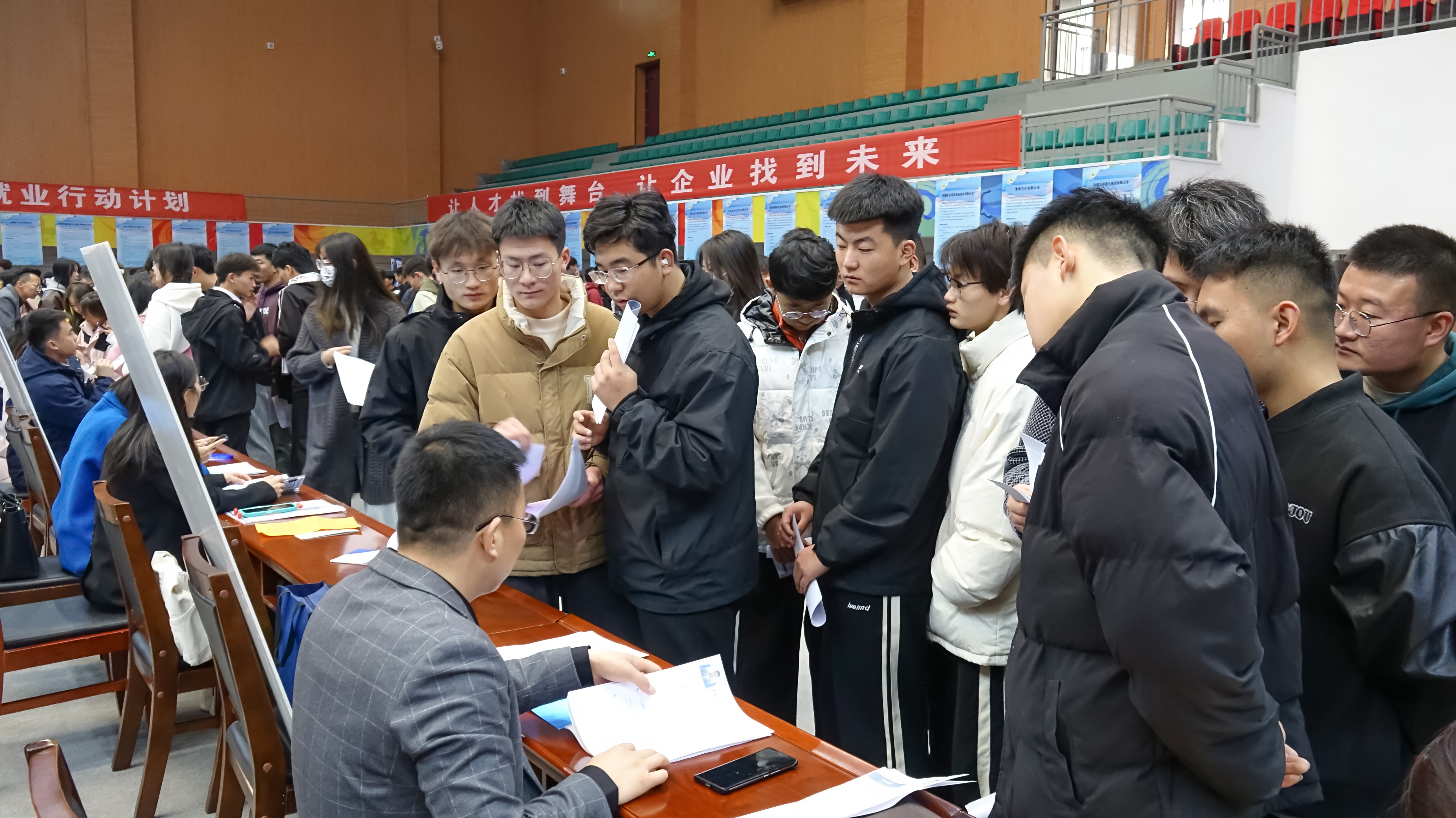 雙選會現(xiàn)場,學(xué)生志愿者耐心引導(dǎo)前來參會的同學(xué)入場求職。畢業(yè)生們來往于各招聘展位之間,與用人單位面對面交流,認(rèn)真查看招聘信息,挑選自己心儀的工作崗位。會場里接踵比肩,氣氛十分熱烈。