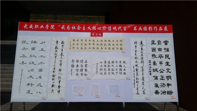 本次大賽自4月啟動以來,共收到來自全院學(xué)生的370余件作品,分為軟筆書法、硬筆書法、繪畫、攝影、手工五大類。經(jīng)過篩選有137件作品進(jìn)入復(fù)賽,作品緊扣社會主義核心價(jià)值觀主題,以生動的藝術(shù)形象、藝術(shù)形式展示社會主義核心價(jià)值觀。院團(tuán)委邀請人文教育藝術(shù)系的藍(lán)明東、祁小剛、趙向峰、薛媛、蘆曉鵬教師組成評審小組,對參賽作品分組評審,評選出一等獎4名,二等獎7名,三等獎9名,優(yōu)秀獎15名。獲獎作品在學(xué)院大學(xué)生活動中心、武威職業(yè)學(xué)院團(tuán)青微信公眾平臺同時(shí)展出。