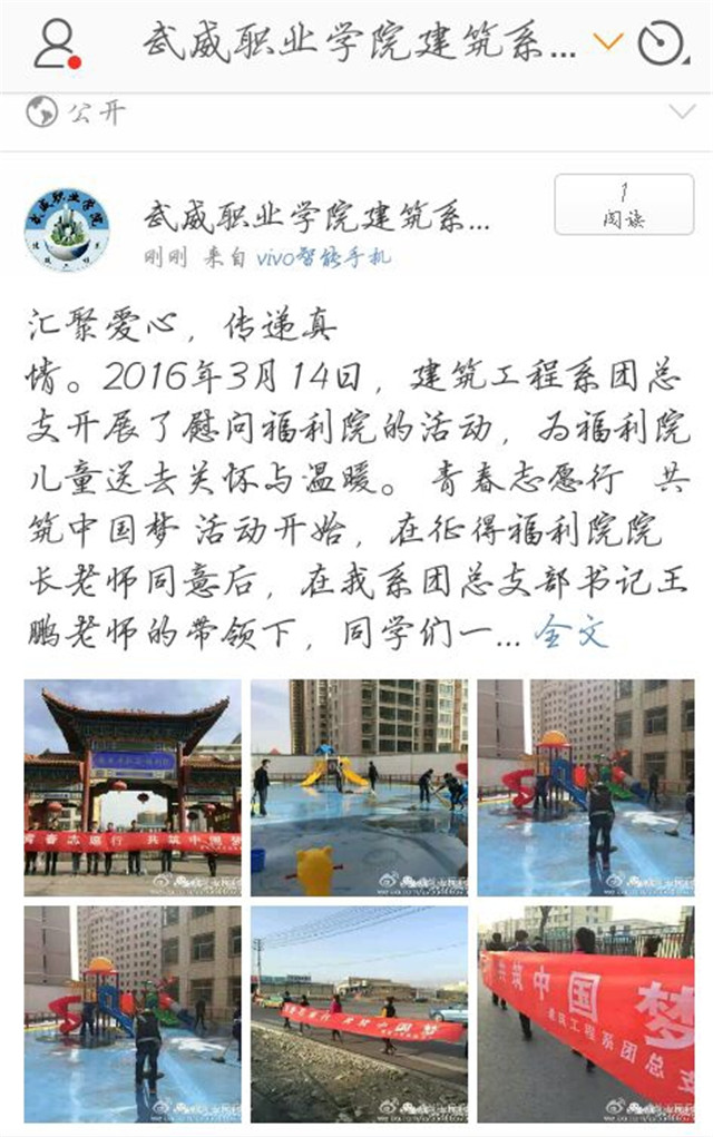 一是建筑系團總支組織10名青年志愿者走進武威社會福利院開展志愿服務(wù)活動。志愿者們走進教室和孩子們聊天互動、做游戲,清掃、整理幼兒廣場,展示了我系志愿者的青春風(fēng)采,使孩子們和青年學(xué)生真正感受到雷鋒活在當(dāng)代、活在身邊。
