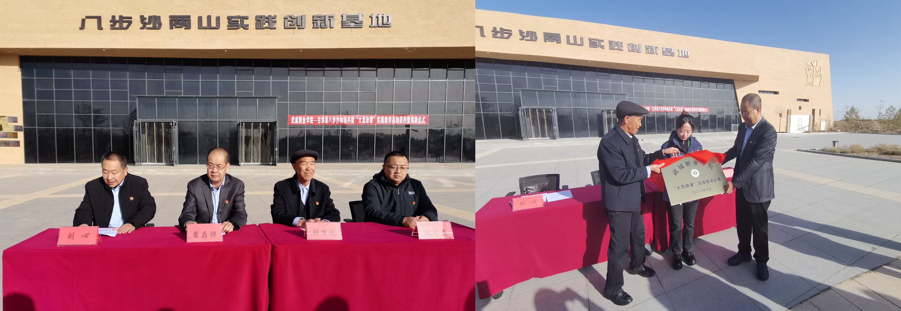 為深入貫徹落實習(xí)近平總書記關(guān)于“大思政課”的重要指示批示精神,充分發(fā)揮武威紅色優(yōu)質(zhì)資源在思政課實踐育人中的重要作用,11月8日,武威職業(yè)學(xué)院與古浪縣八步沙林場共建“大思政課”實踐教學(xué)基地簽約掛牌暨實踐教學(xué)活動在古浪縣八步沙林場舉行。學(xué)校黨委副書記翟存祥、古浪縣八步沙林場場長郭萬剛、學(xué)校宣傳統(tǒng)戰(zhàn)部負(fù)責(zé)人魏全民出席儀式,部分師生代表參加儀式,儀式由馬克思主義學(xué)院負(fù)責(zé)人劉心主持。