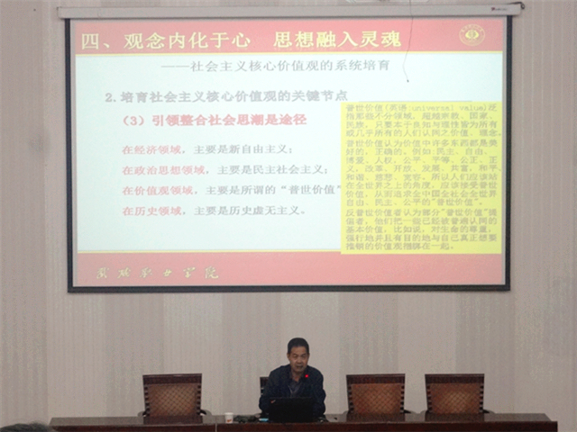 翟存祥從人民要有信仰國家才有力量、凝聚中國精神傳遞中國聲音、時代召喚理論理論助推時間、觀念內(nèi)化于心思想融入靈魂、精神外化于行夢想落地生根等五個方面入手,運用哲學(xué)社會學(xué)、文化心理學(xué)、國學(xué)文化等學(xué)科領(lǐng)域上的獨特見解,將傳統(tǒng)文化和社會科學(xué)深度融合,對社會主義核心價值觀產(chǎn)生的時代背景、頂層設(shè)計、與核心價值體系的關(guān)系、系統(tǒng)培育、全面踐行等問題進(jìn)行了深入剖析,為全系師生擺脫生活困擾、消除不健康思維傾向、打造正確人生夢想、積極學(xué)習(xí)、努力工作、快樂生活鎖定了正確的思維方向,其生動的語言、精彩的論證、獨具特色的講座風(fēng)格,獲得了在場師生的熱烈歡迎和陣陣掌聲。