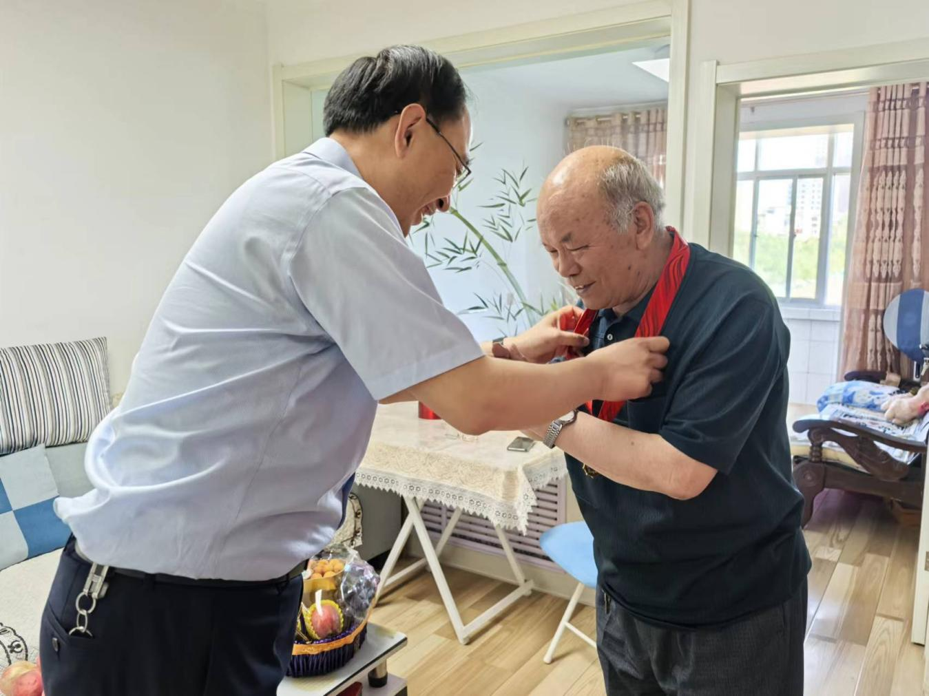 在擁有50年黨齡的退休教師秦光善家中,黨委書記王宏為他頒發(fā)了“光榮在黨50年”紀(jì)念章,并表達(dá)了深深的感謝,同時(shí)叮囑他要保重身體,遇到困難及時(shí)向組織反映。