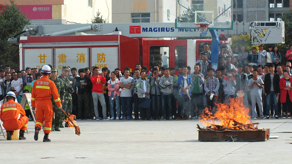 在演練現場,武威消防支隊的工作人員詳細講解了我院配備的ABC型干粉滅火器的性能、用途、操作方法及撲救初起火災的注意事項,并進行了現場演示。2015級各新生代表組成滅火隊依照次序和規(guī)定,進行了模擬火災的現場撲救演練。演練中,滅火隊員動作正確、快捷、滅火過程快速安全,觀摩的同學們也很認真。