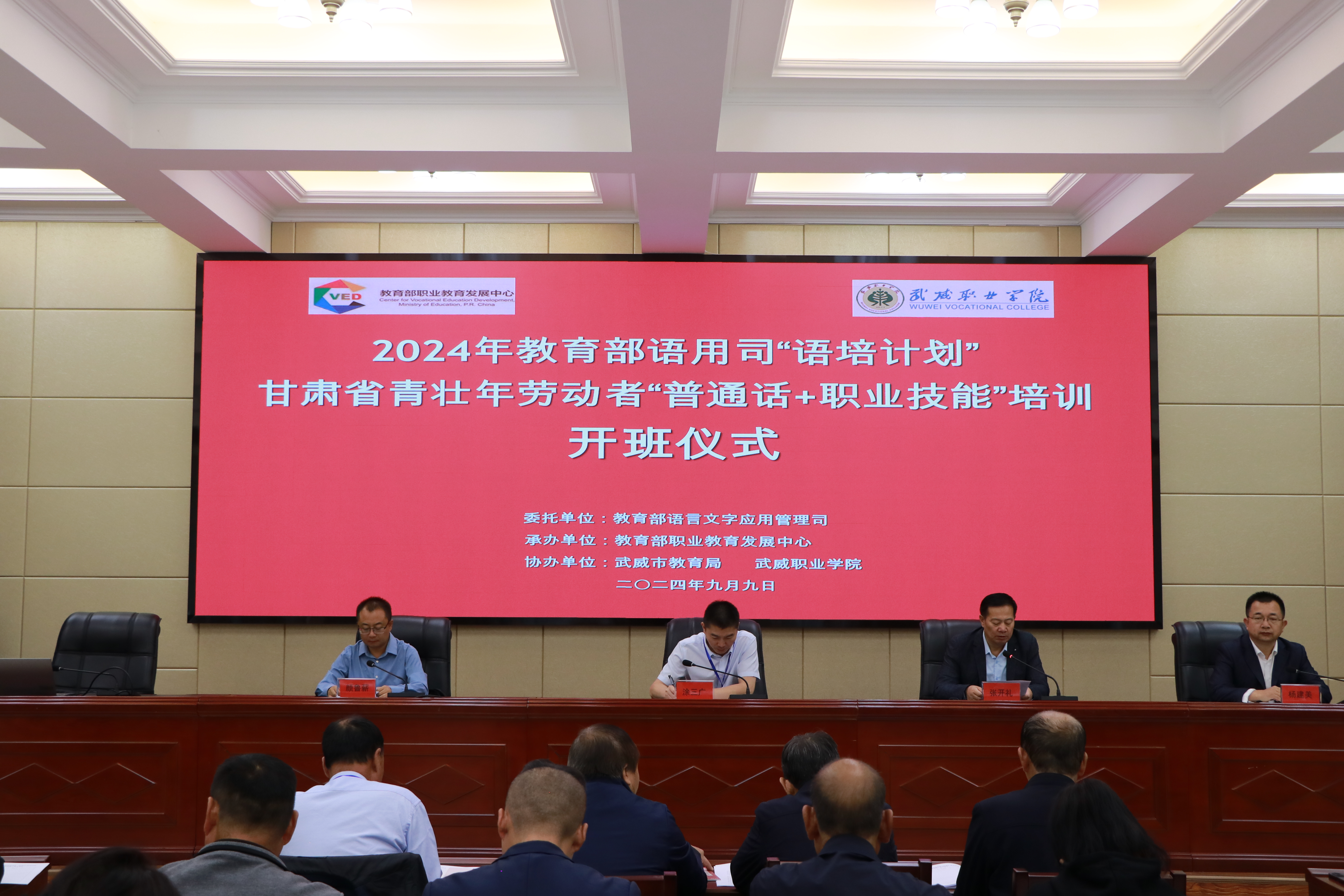 9月9日上午,2024年教育部語用司“語培計(jì)劃”甘肅省青壯年勞動(dòng)者“普通話+職業(yè)技能”培訓(xùn)班在我校正式開班。本次培訓(xùn)是深入貫徹黨的二十大精神和二十屆三中全會(huì)精神,根據(jù)教育部語用司《關(guān)于實(shí)施2024年國家通用語言文字示范性培訓(xùn)計(jì)劃的通知》,受教育部語用司委托,由教育部職業(yè)教育發(fā)展中心承辦、武威市教育局、學(xué)校共同協(xié)辦。本次培訓(xùn)為期5天,共有來自武威市三縣一區(qū)的50余名學(xué)員參加。培訓(xùn)以“語言鋪路,技能致富”為主題,培訓(xùn)內(nèi)容聚焦當(dāng)?shù)剞r(nóng)業(yè)種植技術(shù)技能和畜牧業(yè)養(yǎng)殖技能開展,以古浪“紅禿頭”小麥、民勤蜜瓜等特色農(nóng)產(chǎn)品的栽培養(yǎng)殖技術(shù)為主線,設(shè)計(jì)了“普通話+職業(yè)技能”為主題的課程內(nèi)容,邀請了國家級(jí)普通話測試員、甘肅省農(nóng)業(yè)科學(xué)院專家、武威市農(nóng)科所專家等組成的專家團(tuán)隊(duì)。